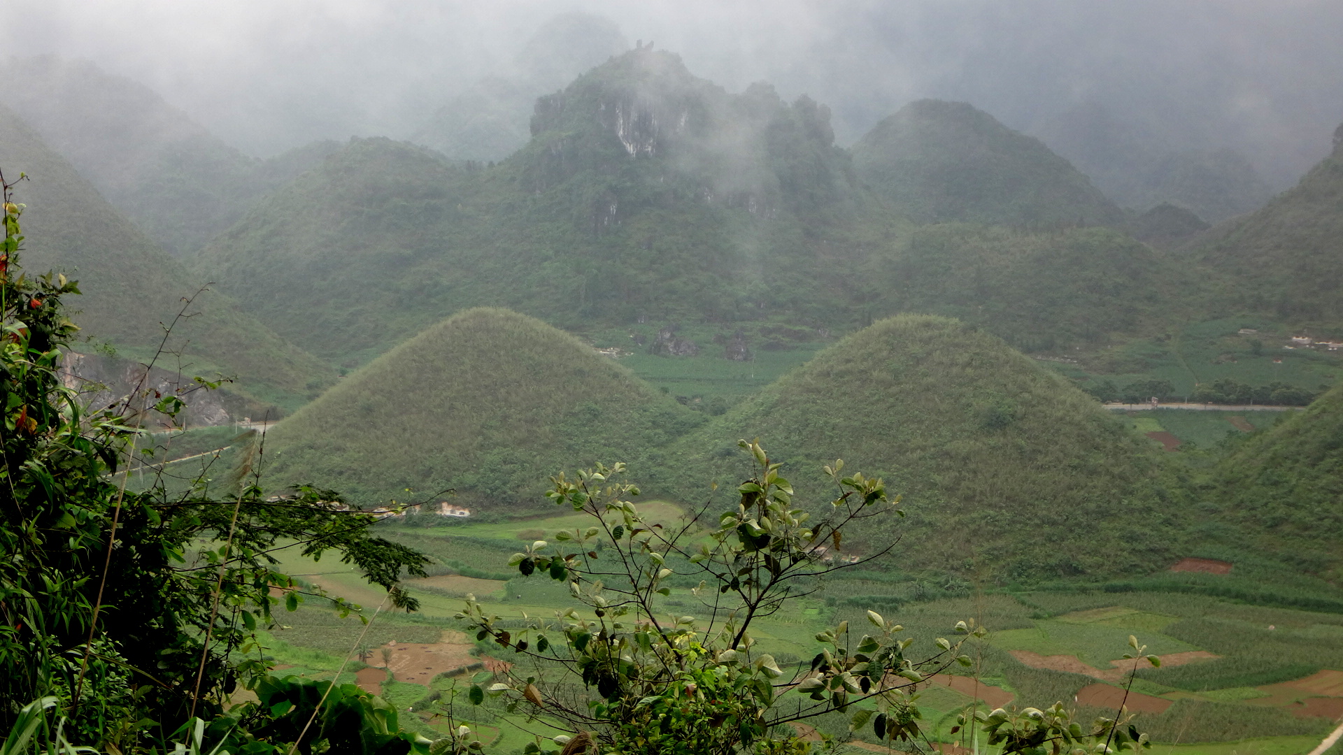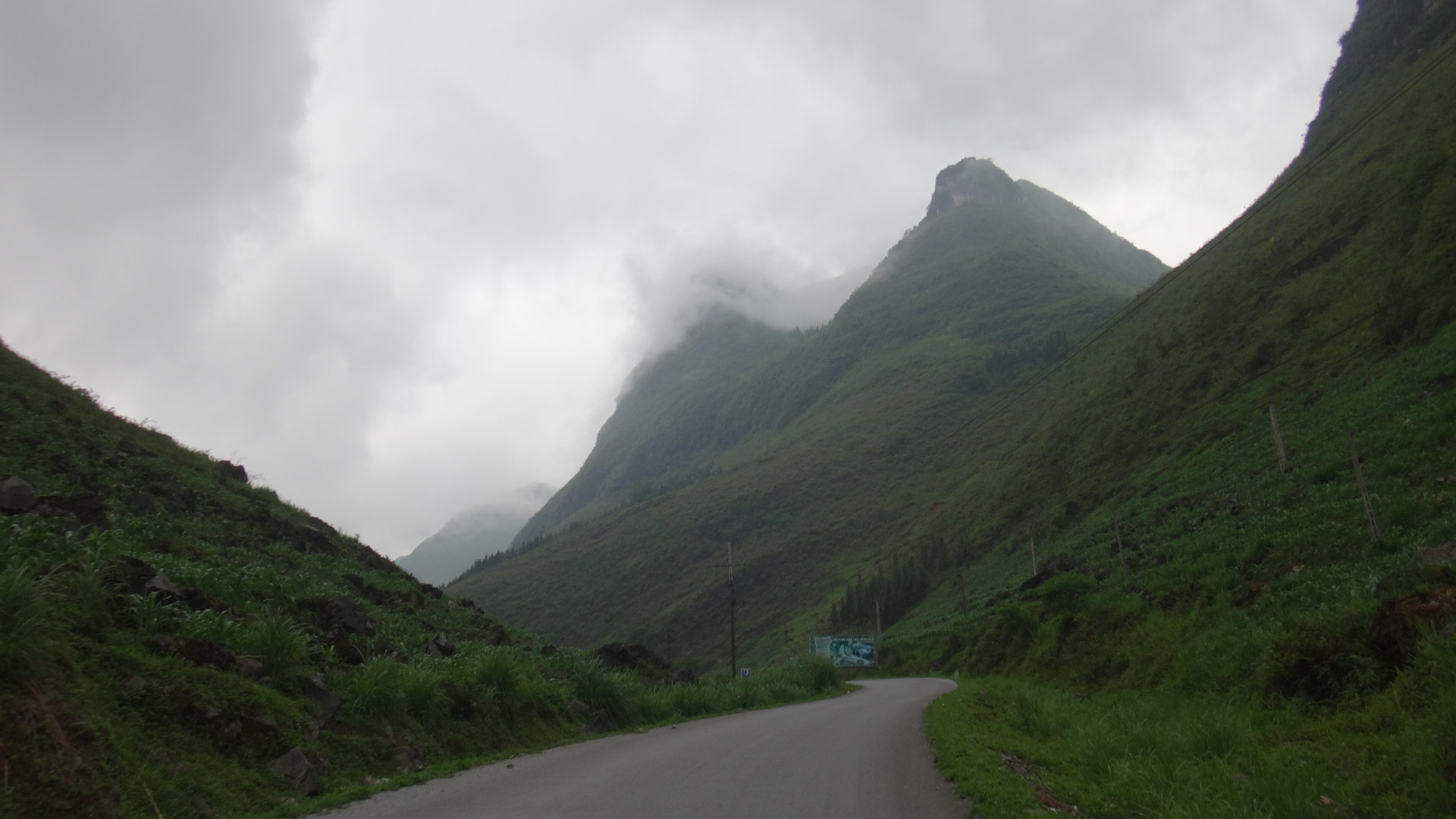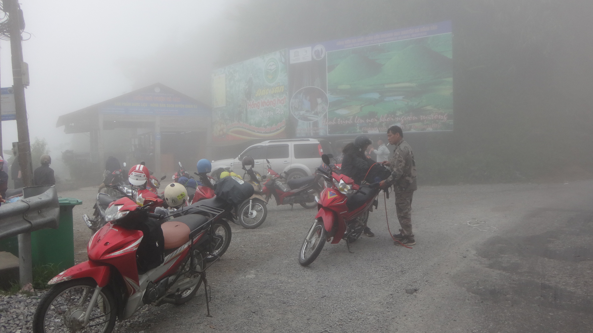 | 高度が上がると霧の中に突入先ほどもいたヨーロッパ系のツーリンググループが停まっているので立ち寄った。ここがQua Ba Heaven Gate だったのらしいが何も見えなかった。しかし少し進むと有名な山が見えた。。 |