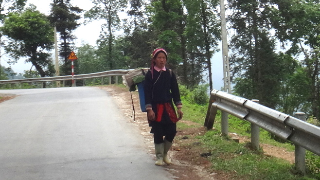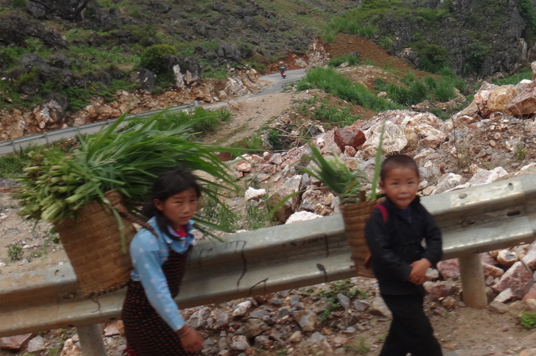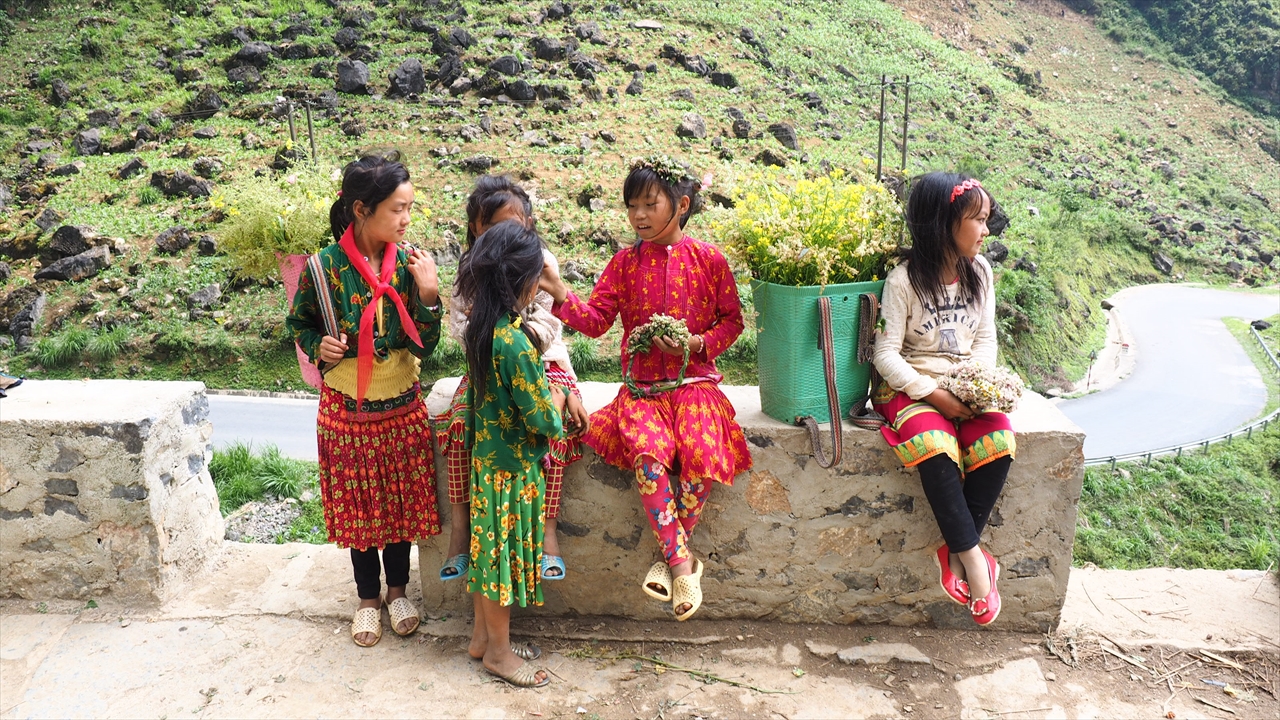 ![]() 登ってきたところろに民族衣装を着た少女たちがいました。驚くことにここHa Giangでは土産物を売りつけに来る人がいない。彼女たちも花をいっぱい持っていました、商品なのでしょうが、売るそぶりも見せません。観光客慣れしていないのでしょう。 |