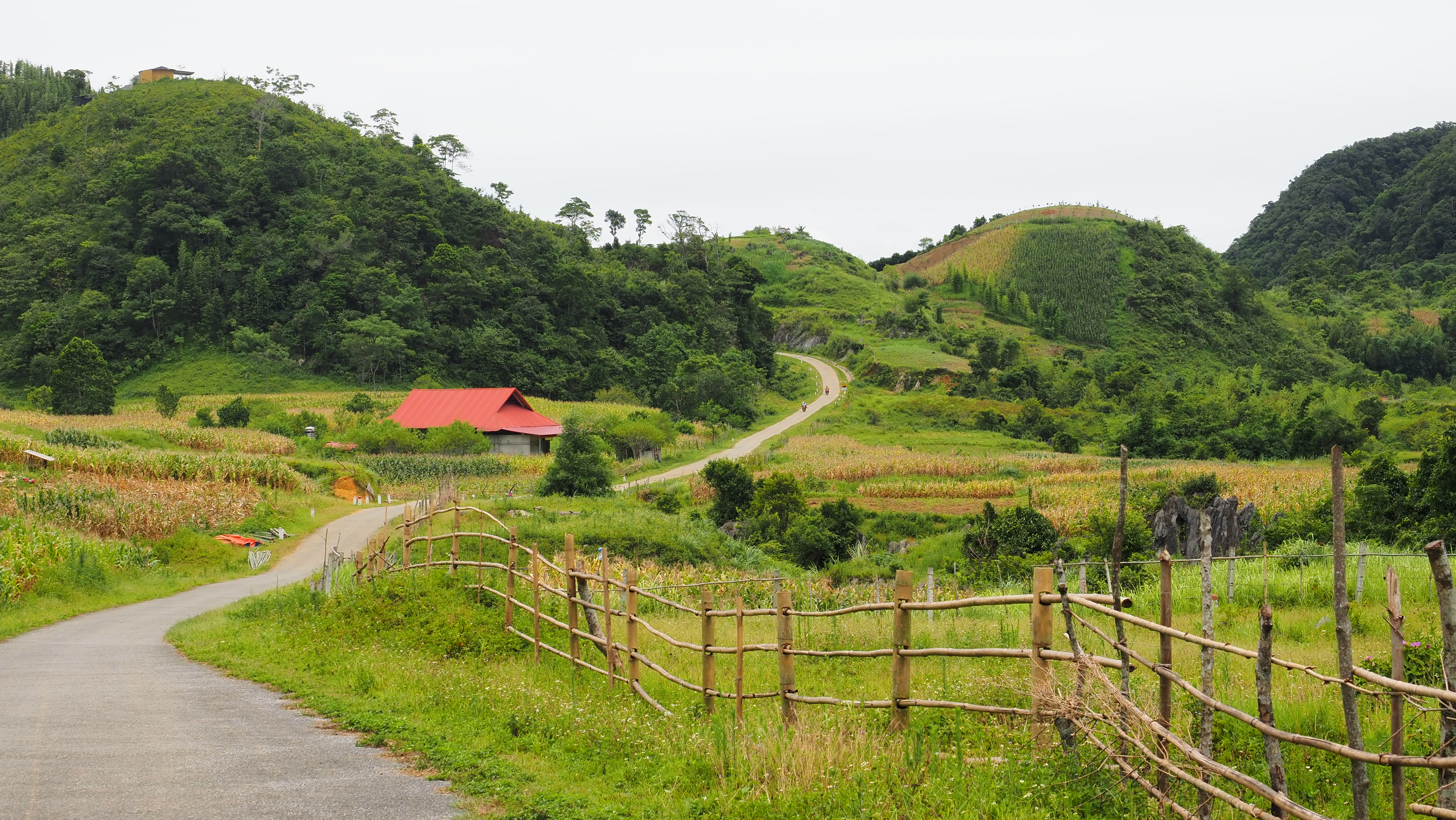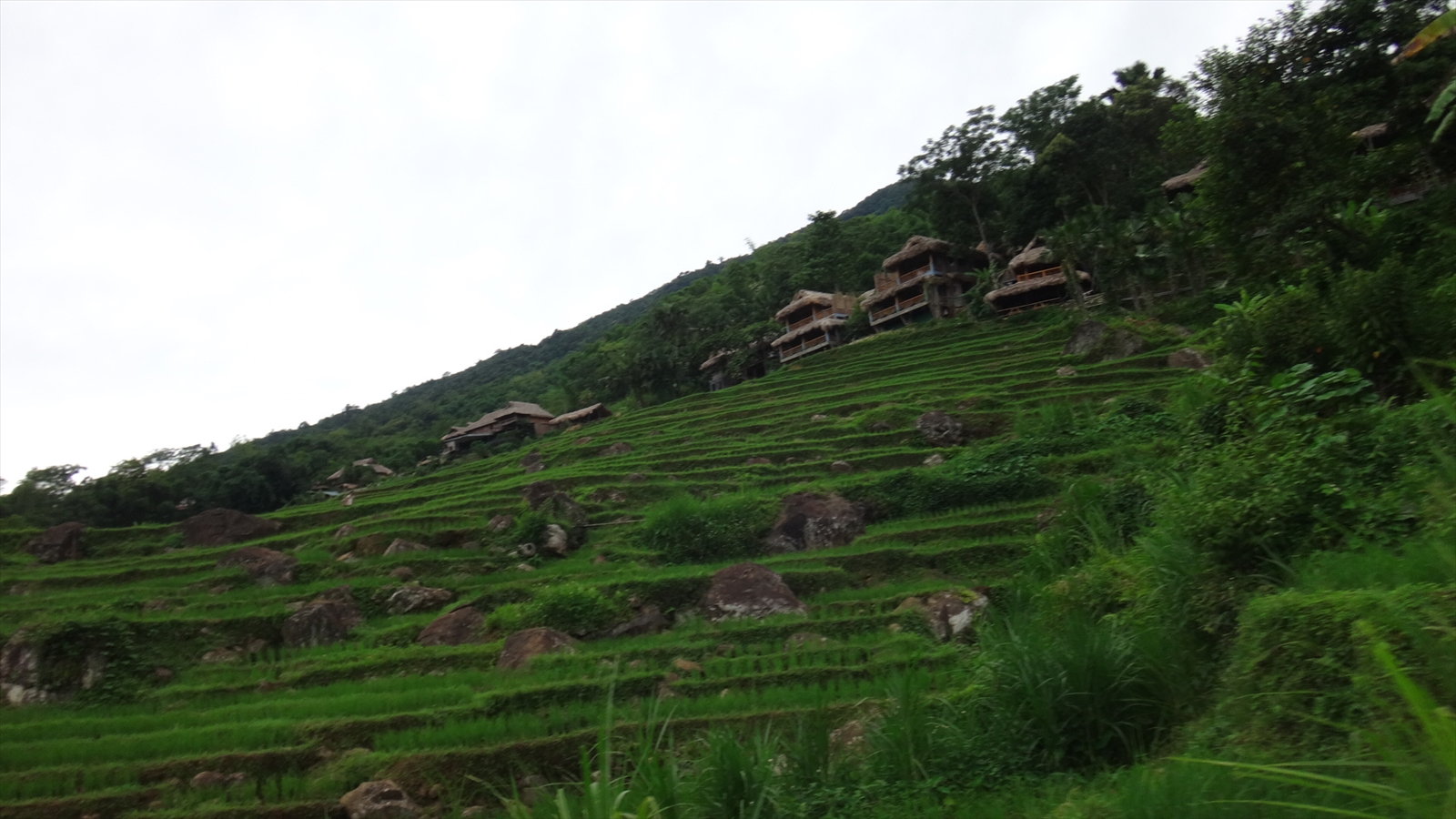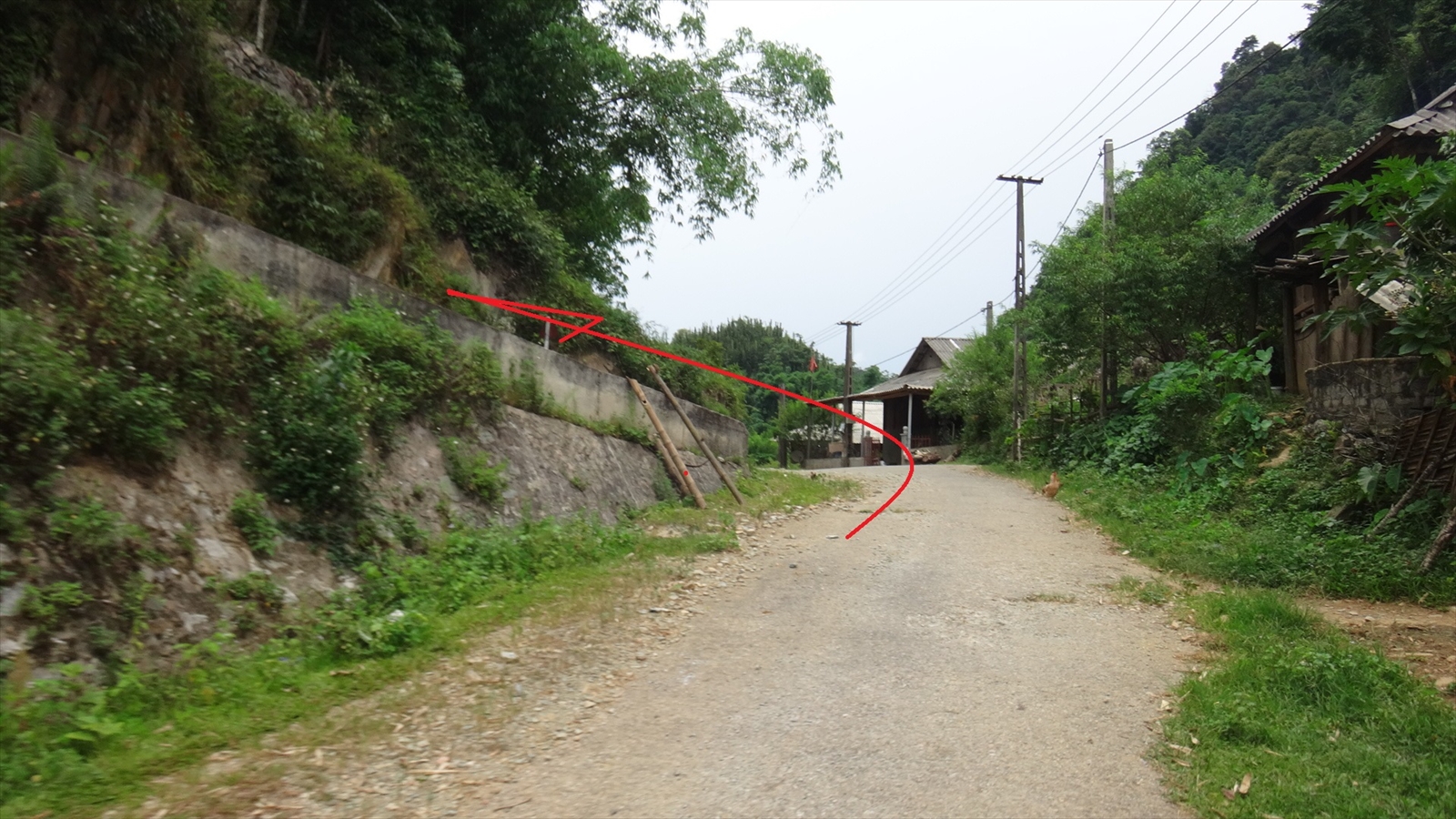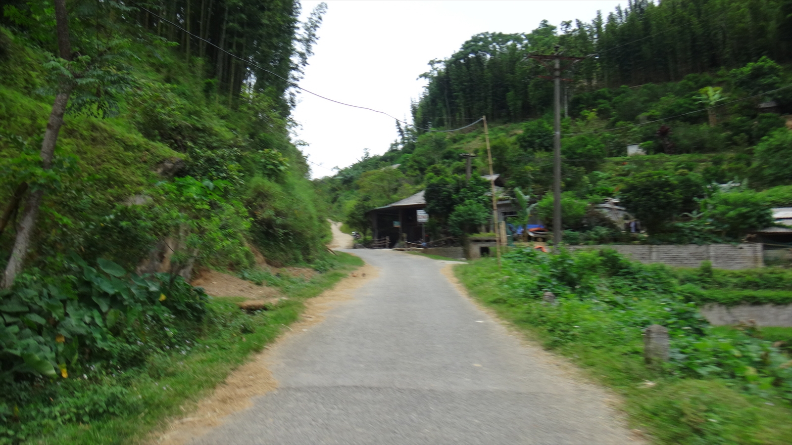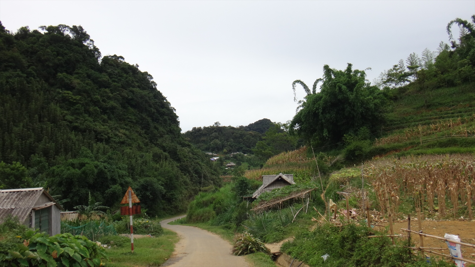 | この集落からあの山の上の畑にも通うのでしょうか? 雰囲気のよさそうなホームステイを通る。 |