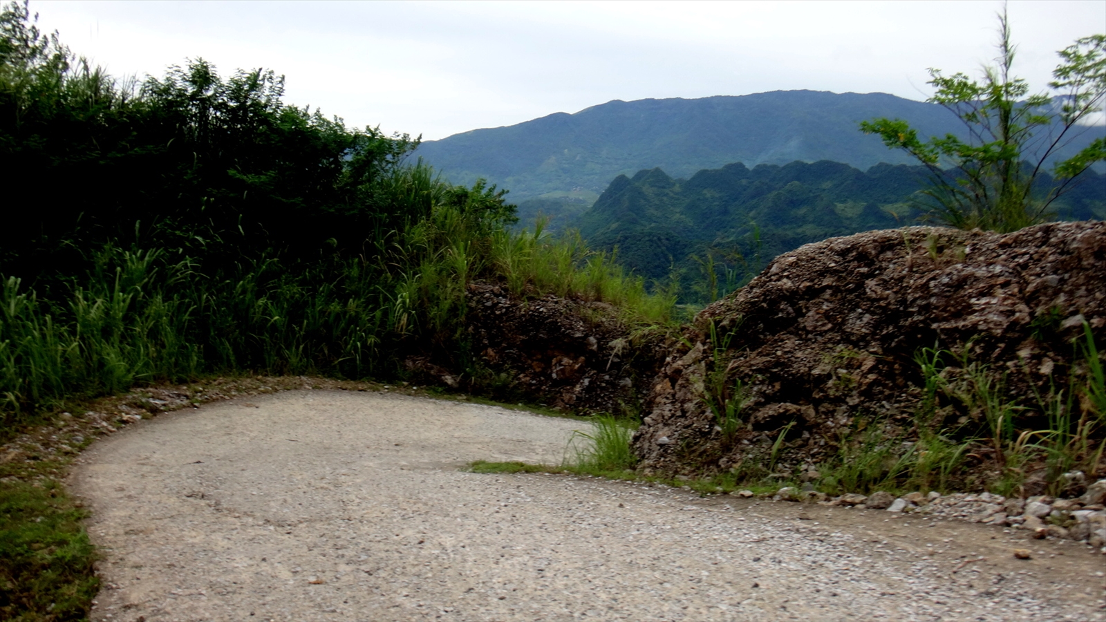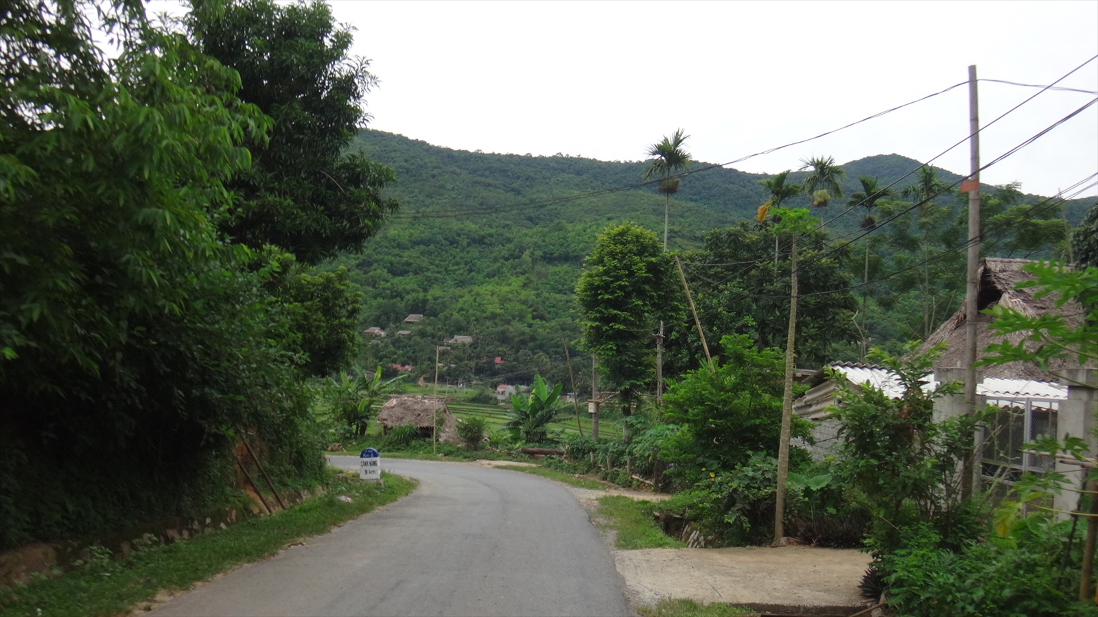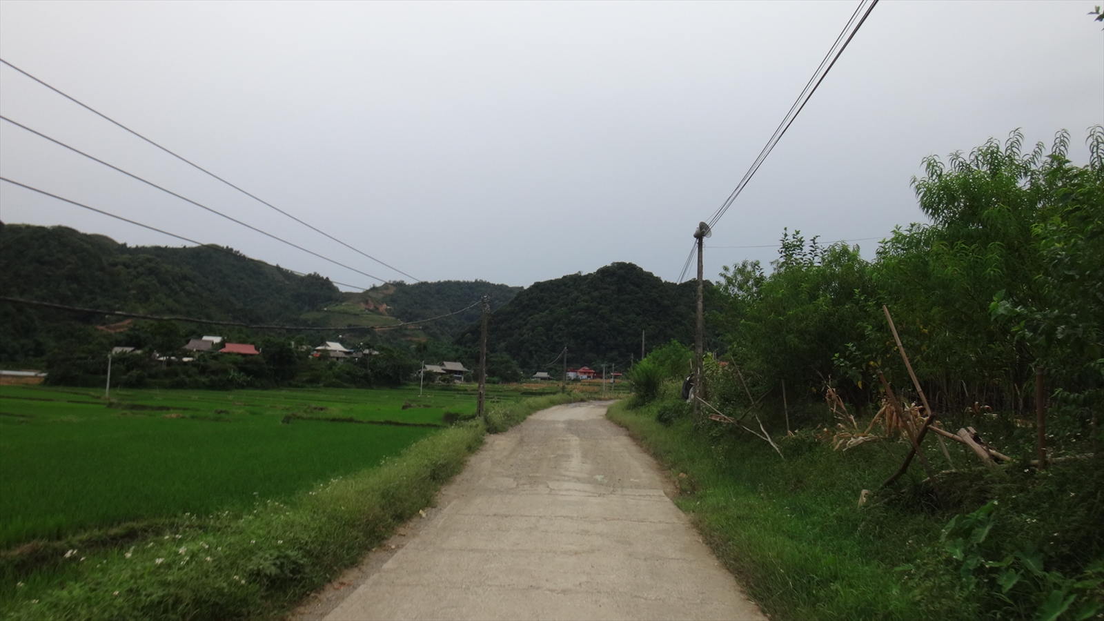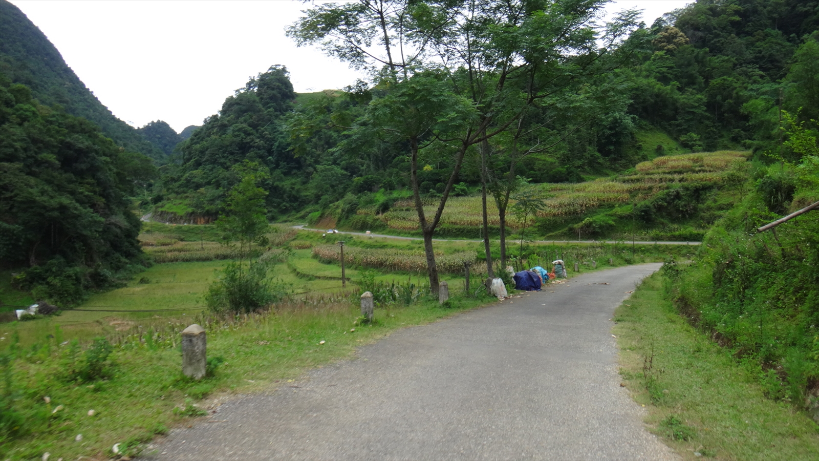 | この集落からあの山の上の畑にも通うのでしょうか? 雰囲気のよさそうなホームステイを通る。 |