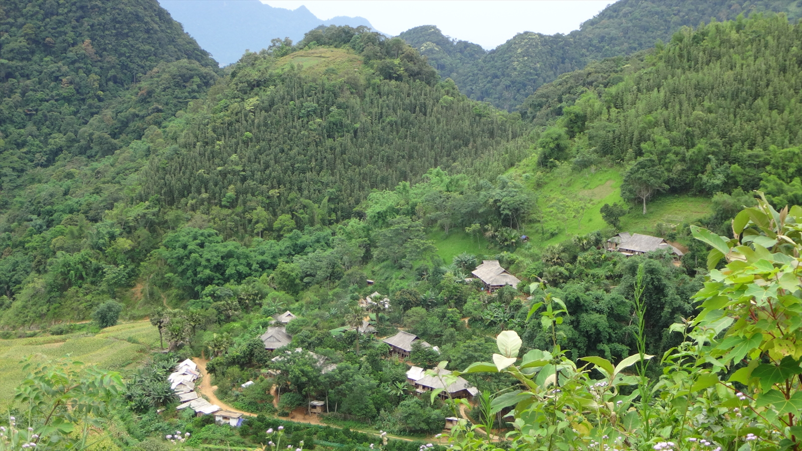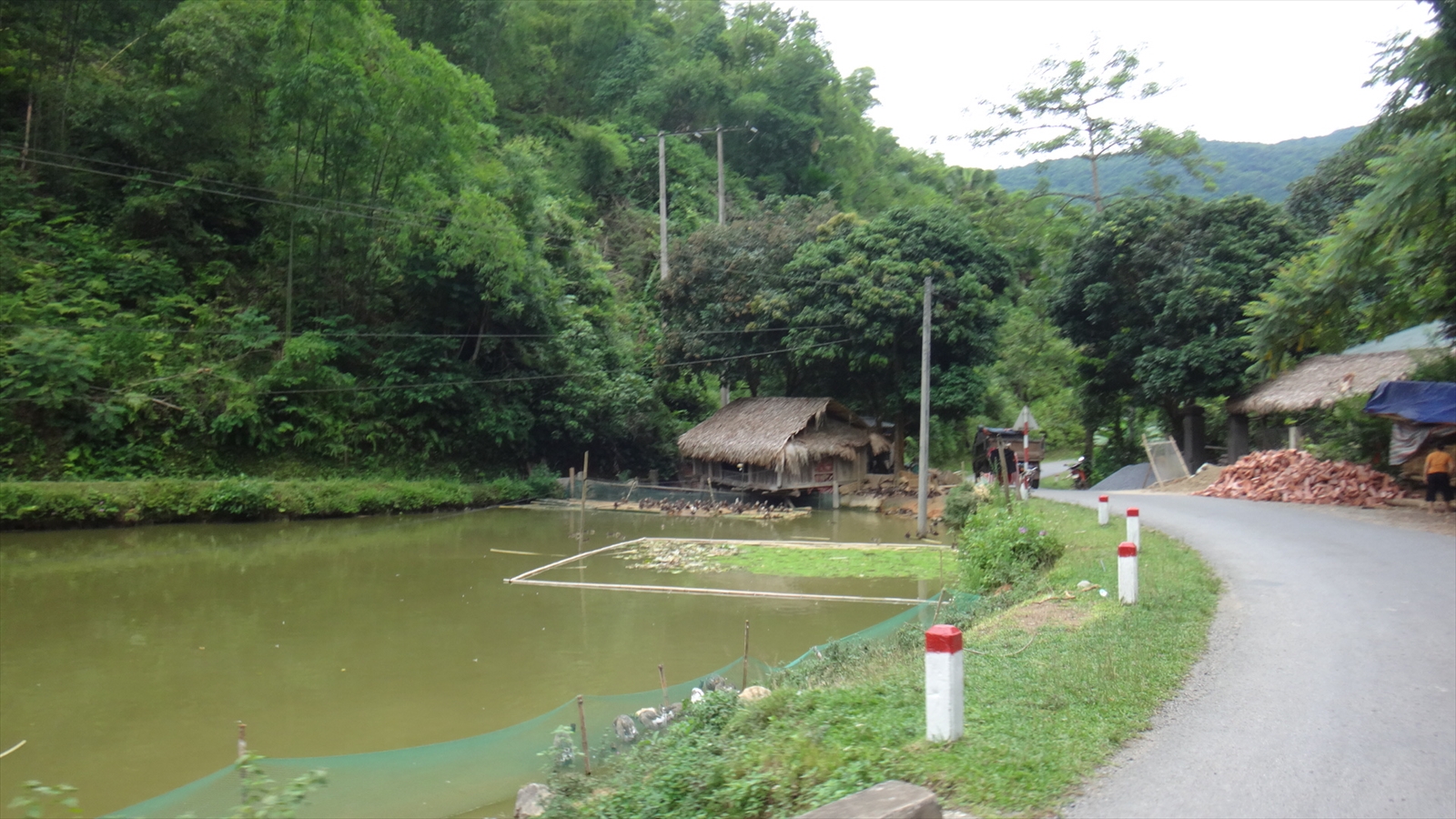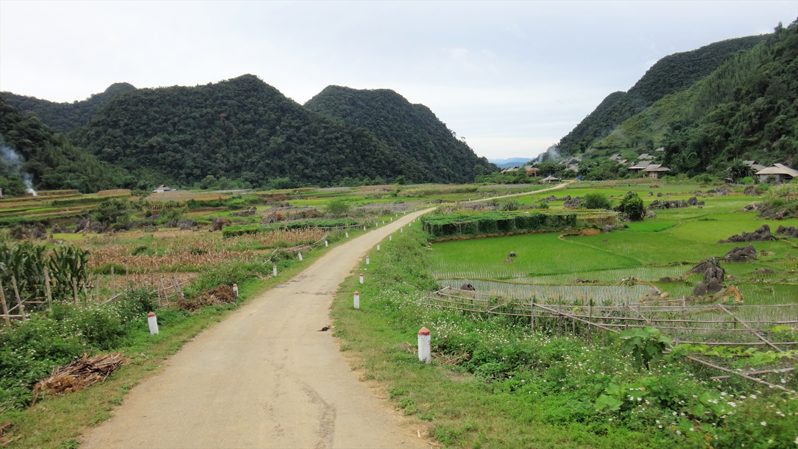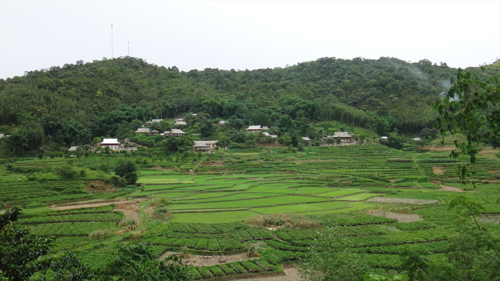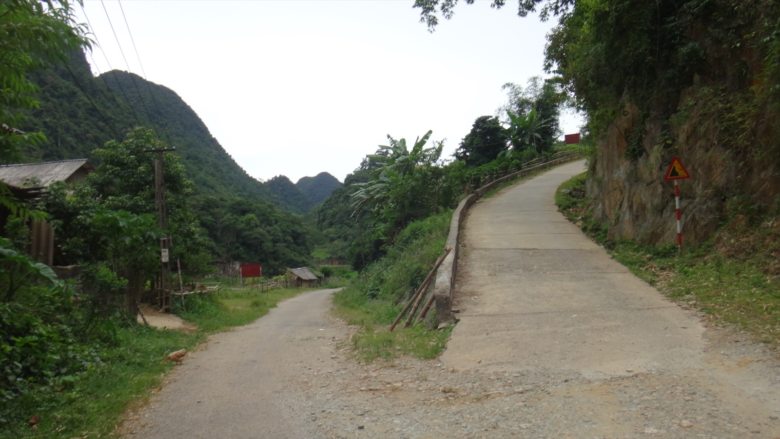| この集落からあの山の上の畑にも通うのでしょうか? 雰囲気のよさそうなホームステイを通る。 |
