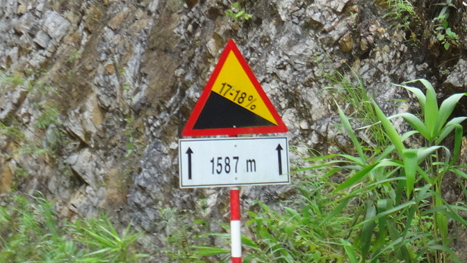 | 先ほどの標識、勾配18%とか書いていたような?と思っていたら出ました17〜18%。すごくない!!そして背の高い切通し。 |