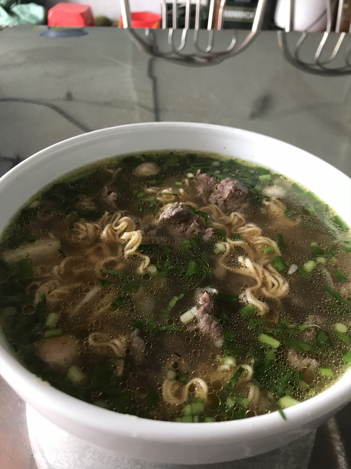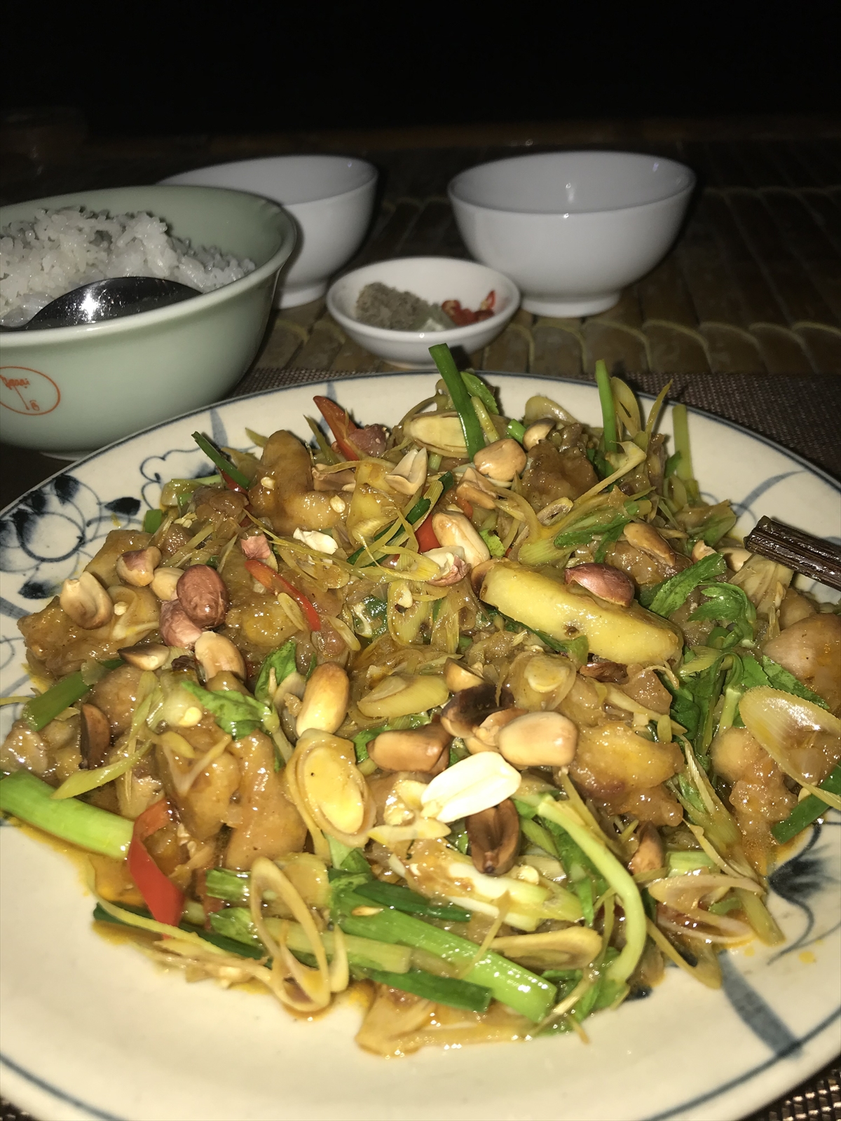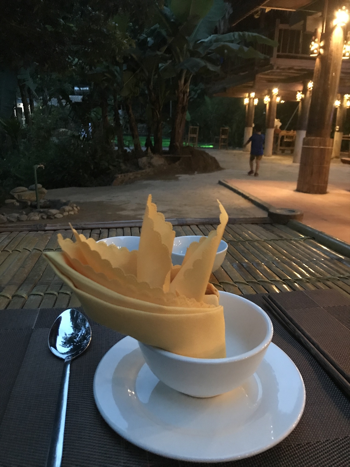 | 散歩から戻りくつろいでいると夕食の注文を取りに来た。メニューを見ても牛・豚・鶏・アヒルというぐらいしかわからないし量もわからない。しかし、ほぼ想像に近い料理が出てきてほっとした。 |
