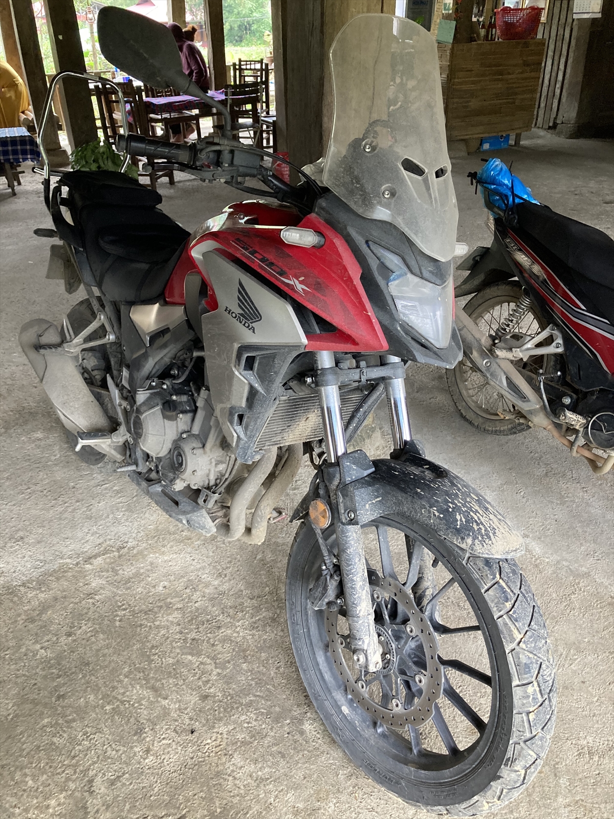 | 昨日見事にドロドロになったバイク、心配していた雨も今のところ大丈夫そうだ。出発してすぐ村の朝市の中を通過することに、混雑するアーケード商店街を走っている感じで緊張した。 |