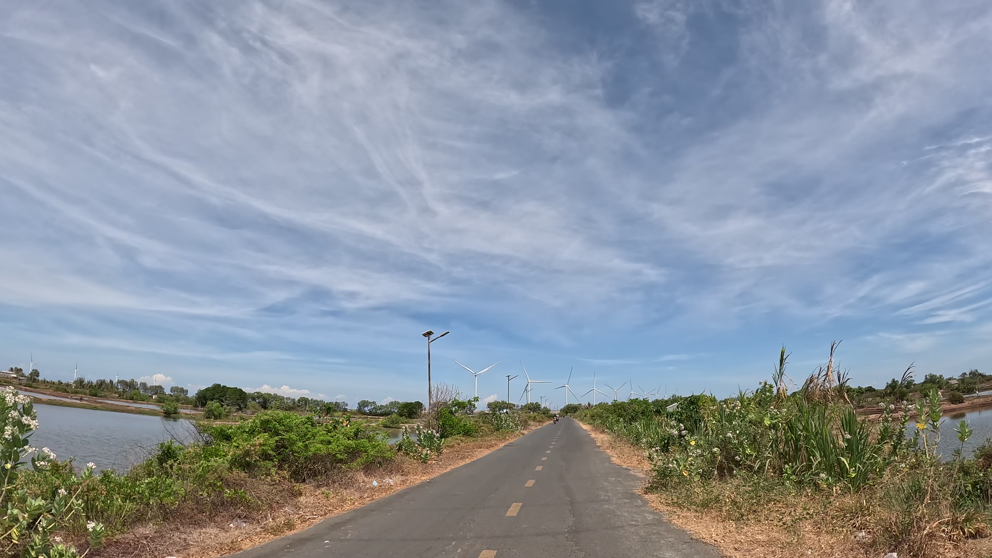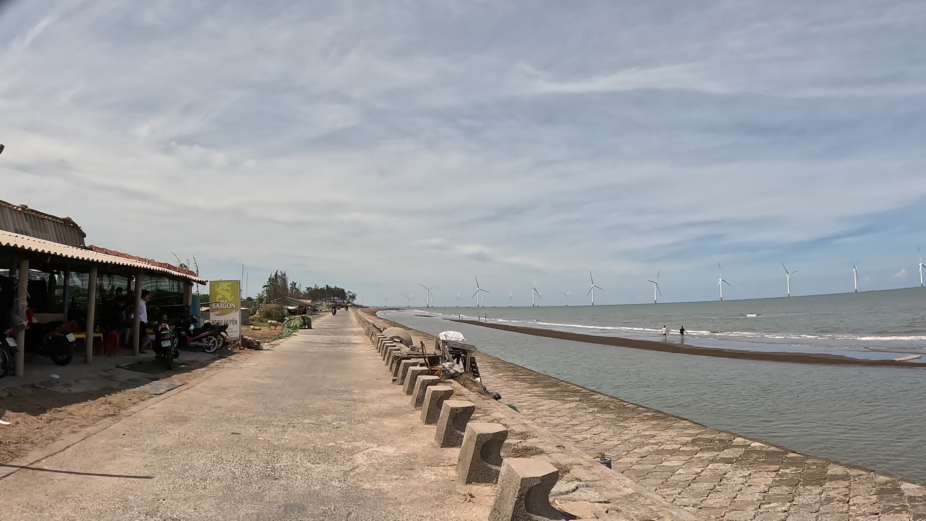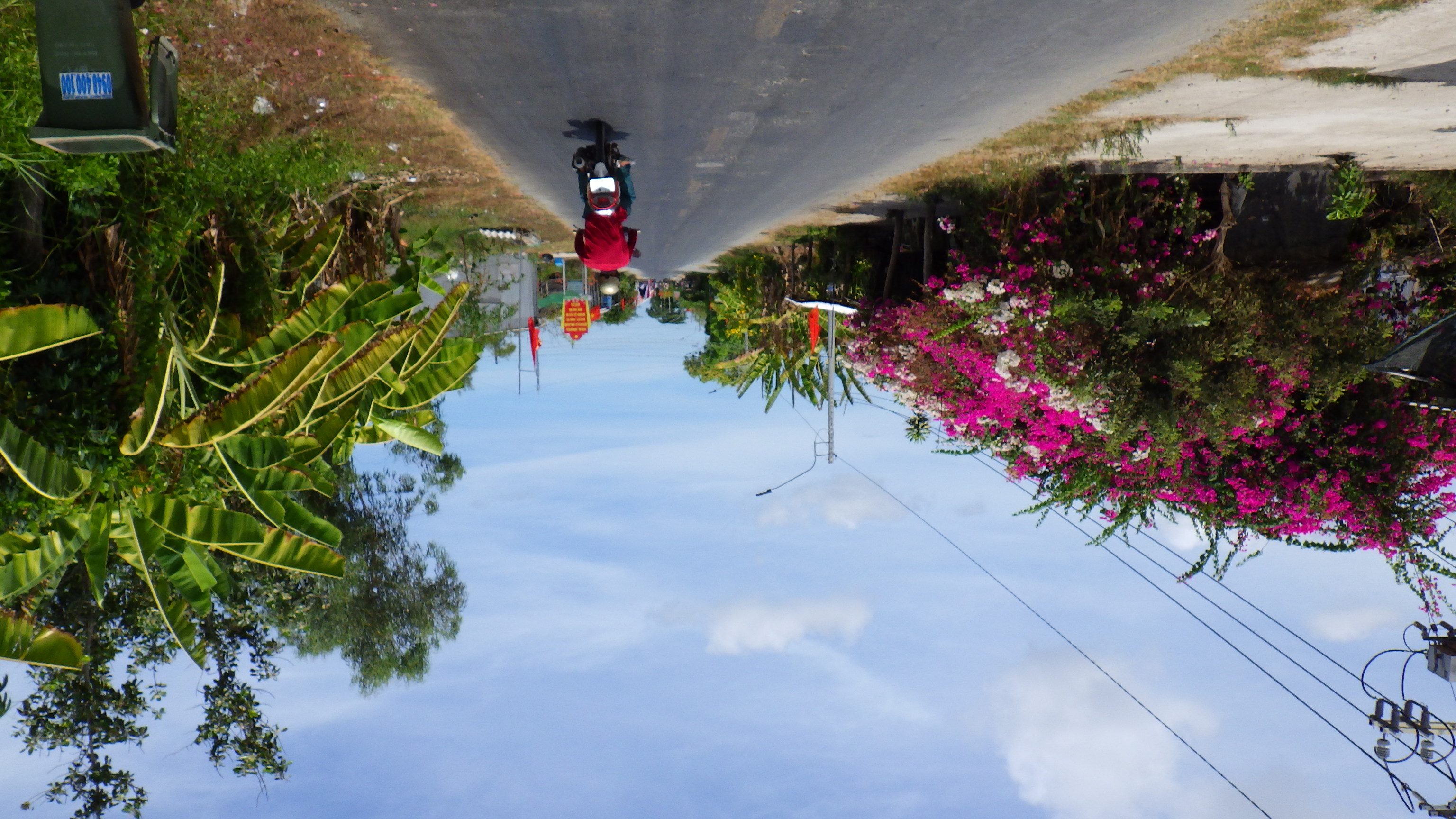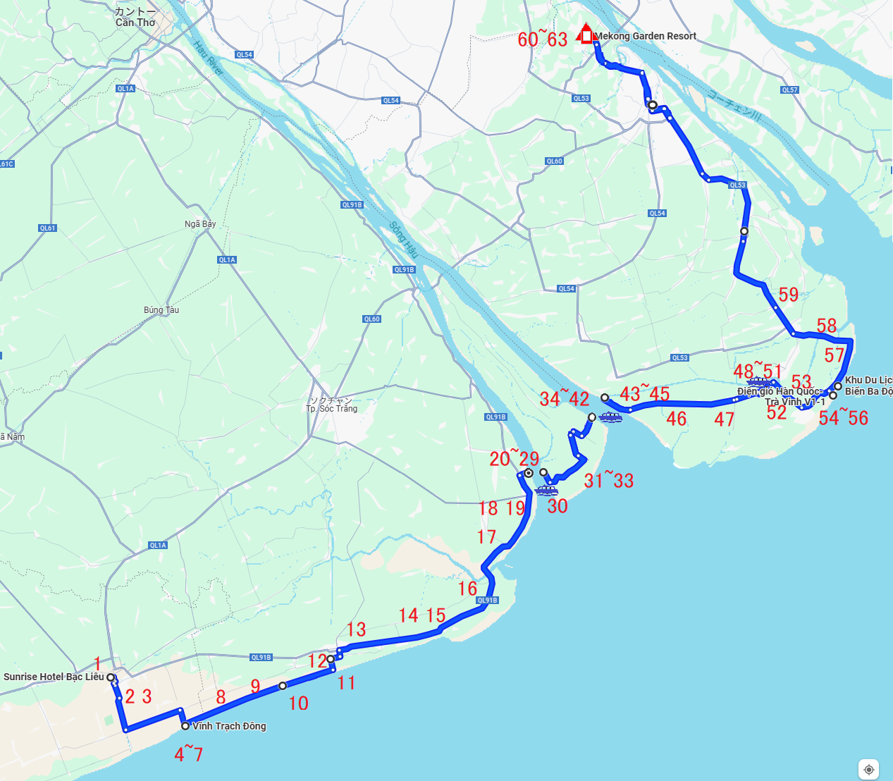 | 洋上発電所を見に海岸線に行ったのだが、それ以外にも明るくて花の多い道や、川を渡るフェリーもなかなか楽しい。メコンデルタは何もないと思っていたがそれなりに楽しいぞ! |