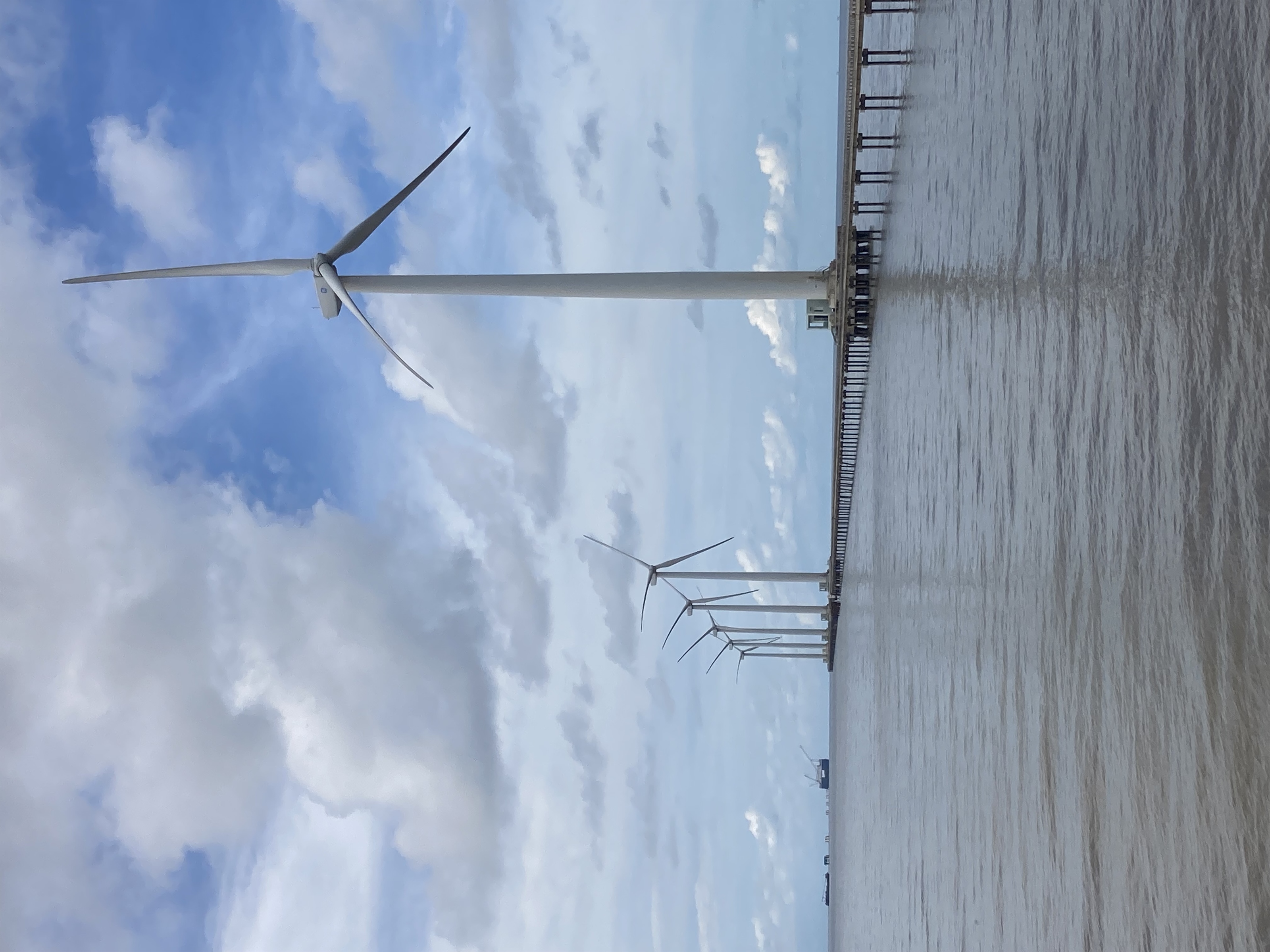 | 風力発電所を目指して走っていると目の前に火力発電所、火力発電所を越えてしばらくすると風力発電所。海沿いに並ぶように建っている。 |