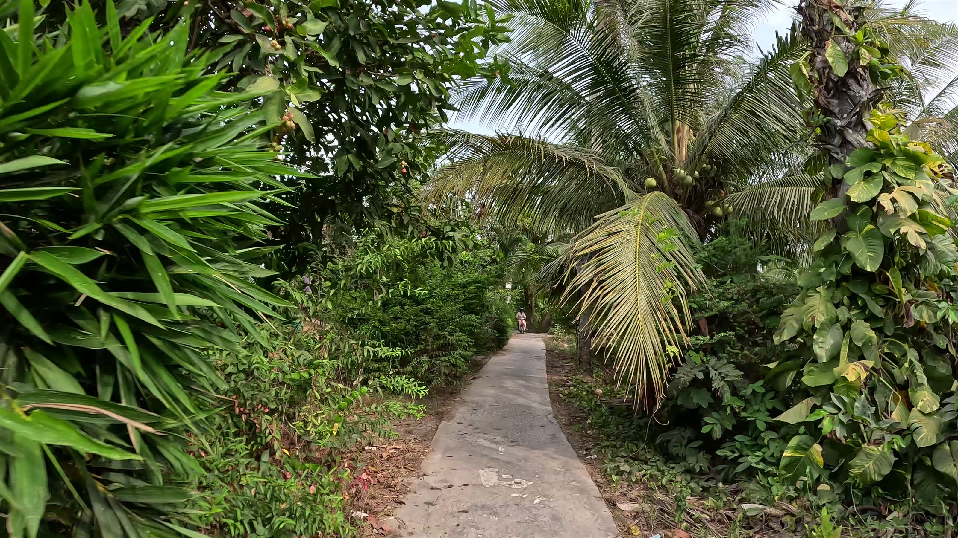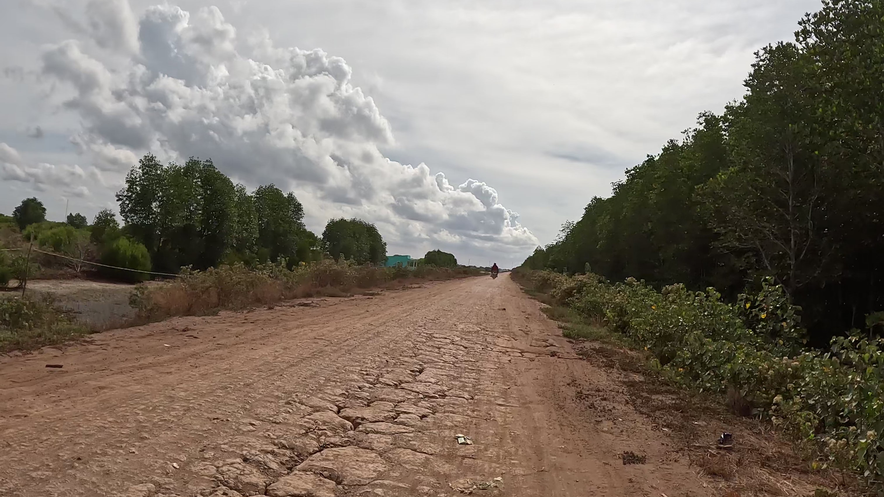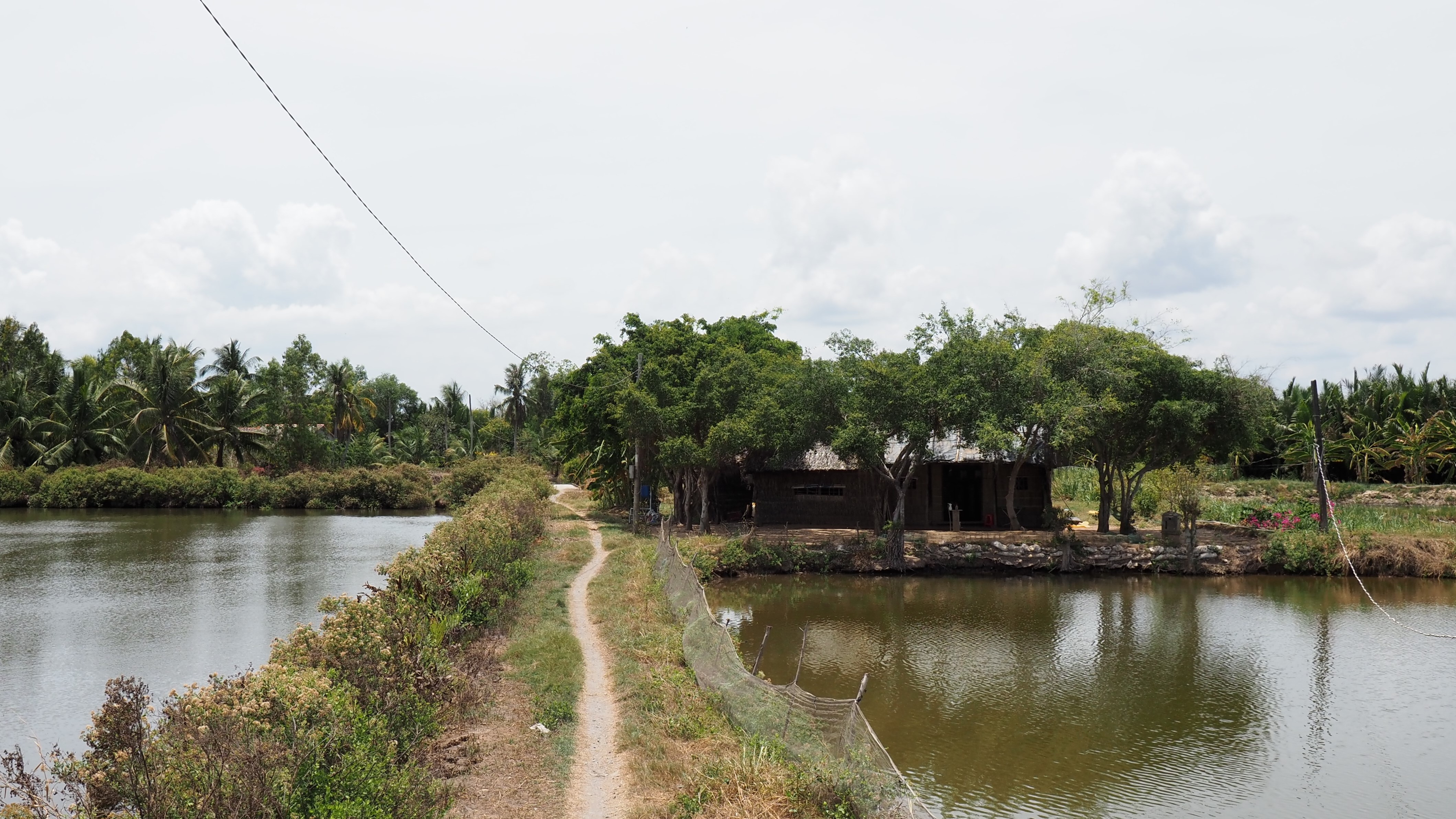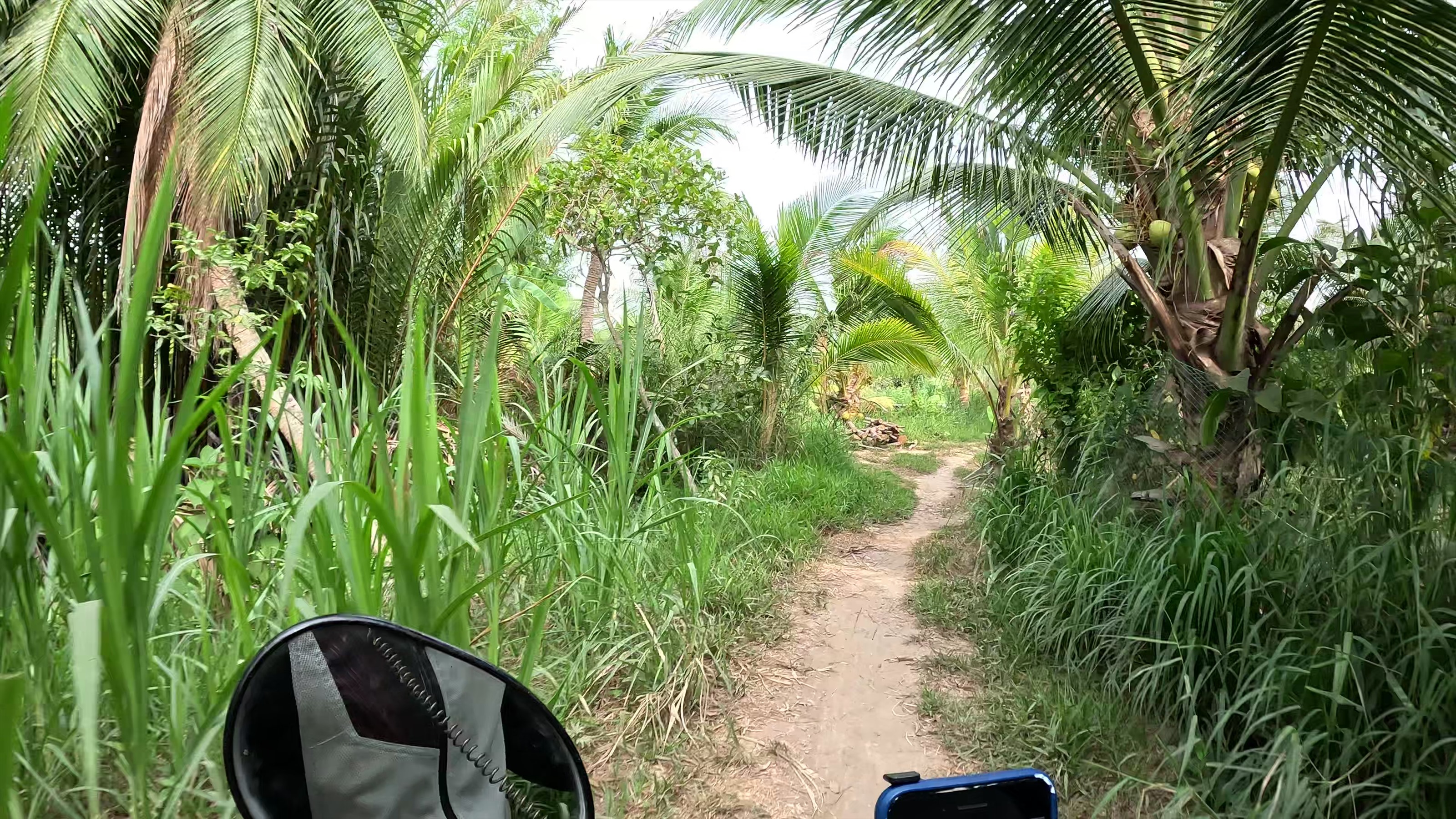 | 目的地Tra Vinh lodgeはもうすぐとほっとしていたのだが、ここで迷走、左にばかり曲がり渦を巻いているような気がする。Lodgeの裏の民家の庭先に迷い込みLodgeに連絡して迎えに来てもらったが、Lodgeはわかるわけないだろうという道にあった。Lodge側からしたらまさかバイクで来るとはと思わなかったらしい。なるほど広い道まで迎えに行くカートが用意されていた。 |