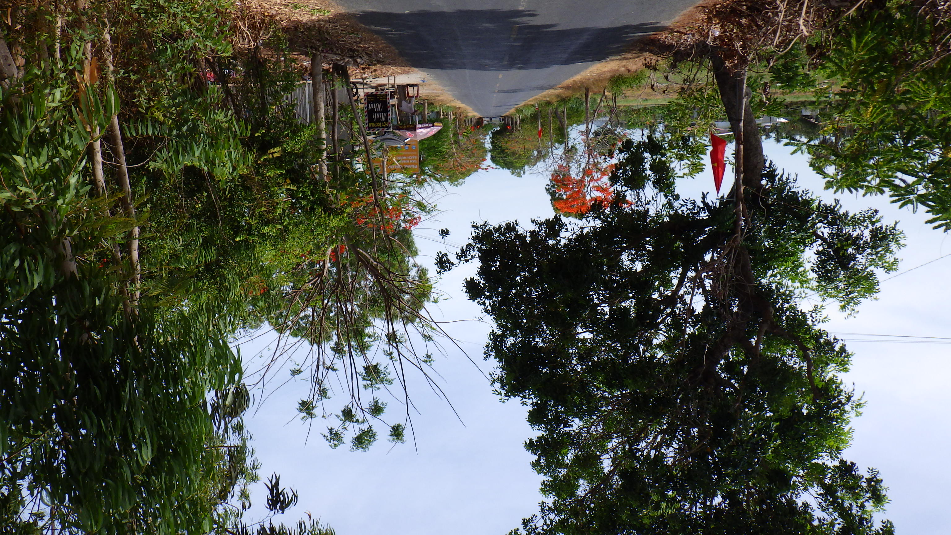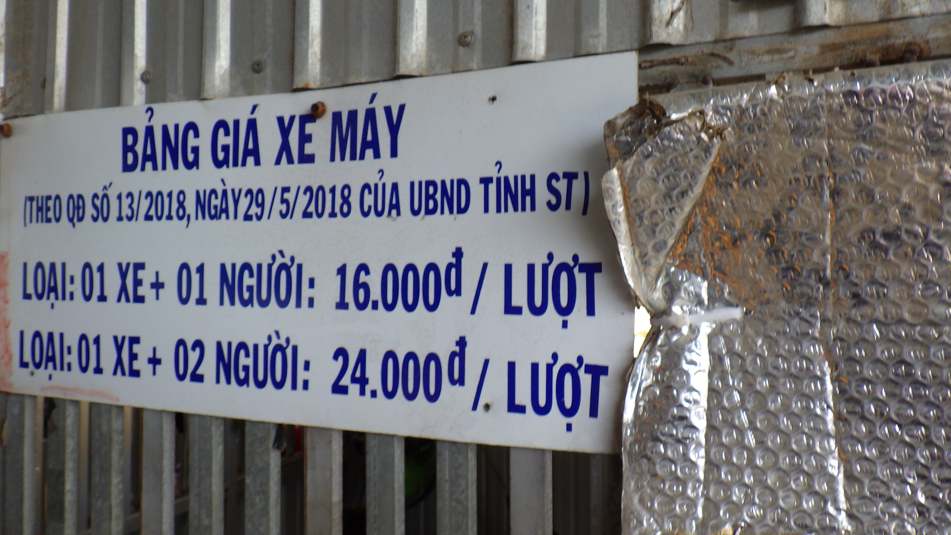 | Hau川の中州Cu Lao Dungは道の両脇に花が咲くのどかなところだ。30分ほどで横切ってしまい渡船乗り場へ。看板の通りバイク一台人二人で24,000VND (145円)少し高くなってきた。 |