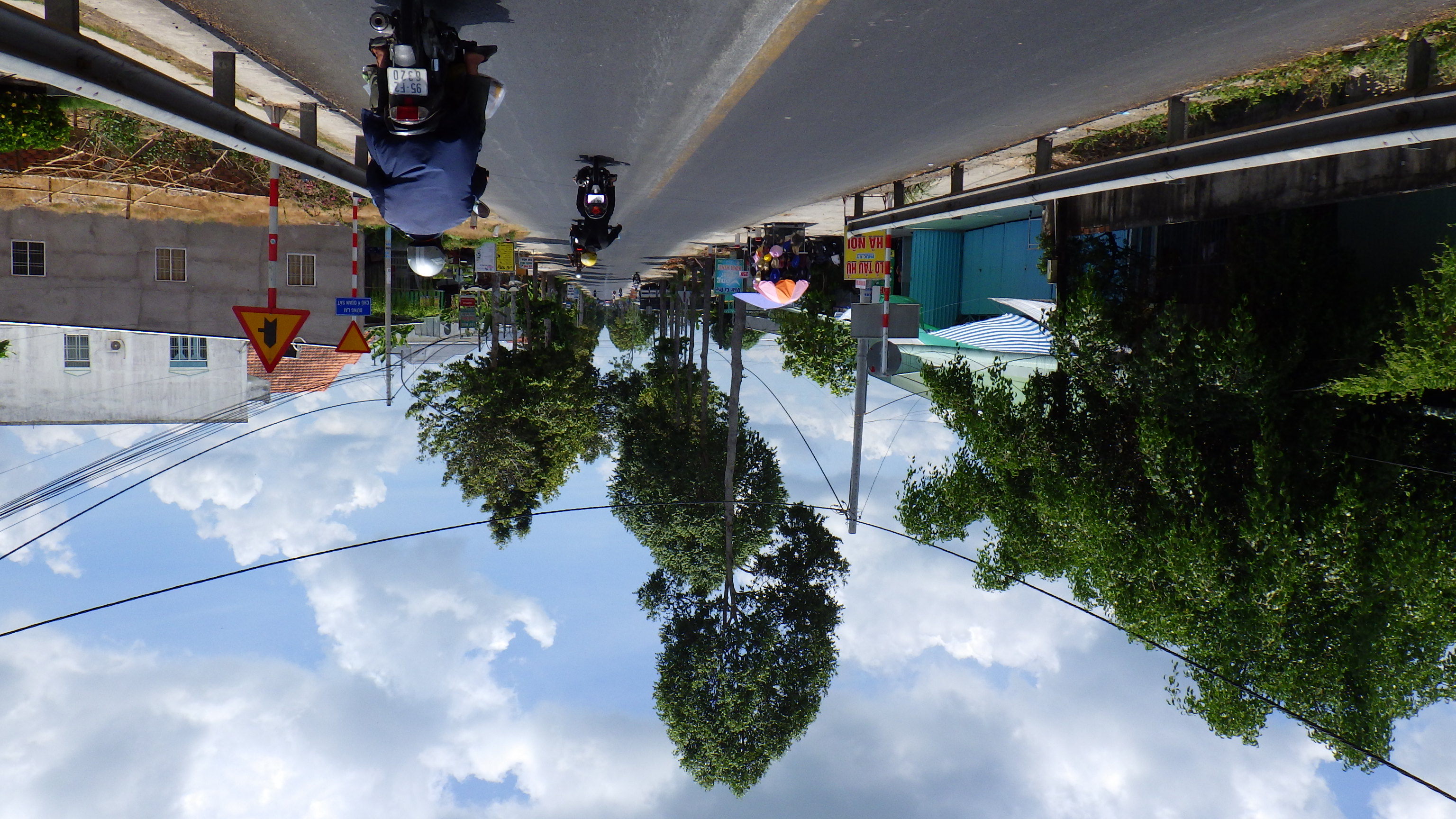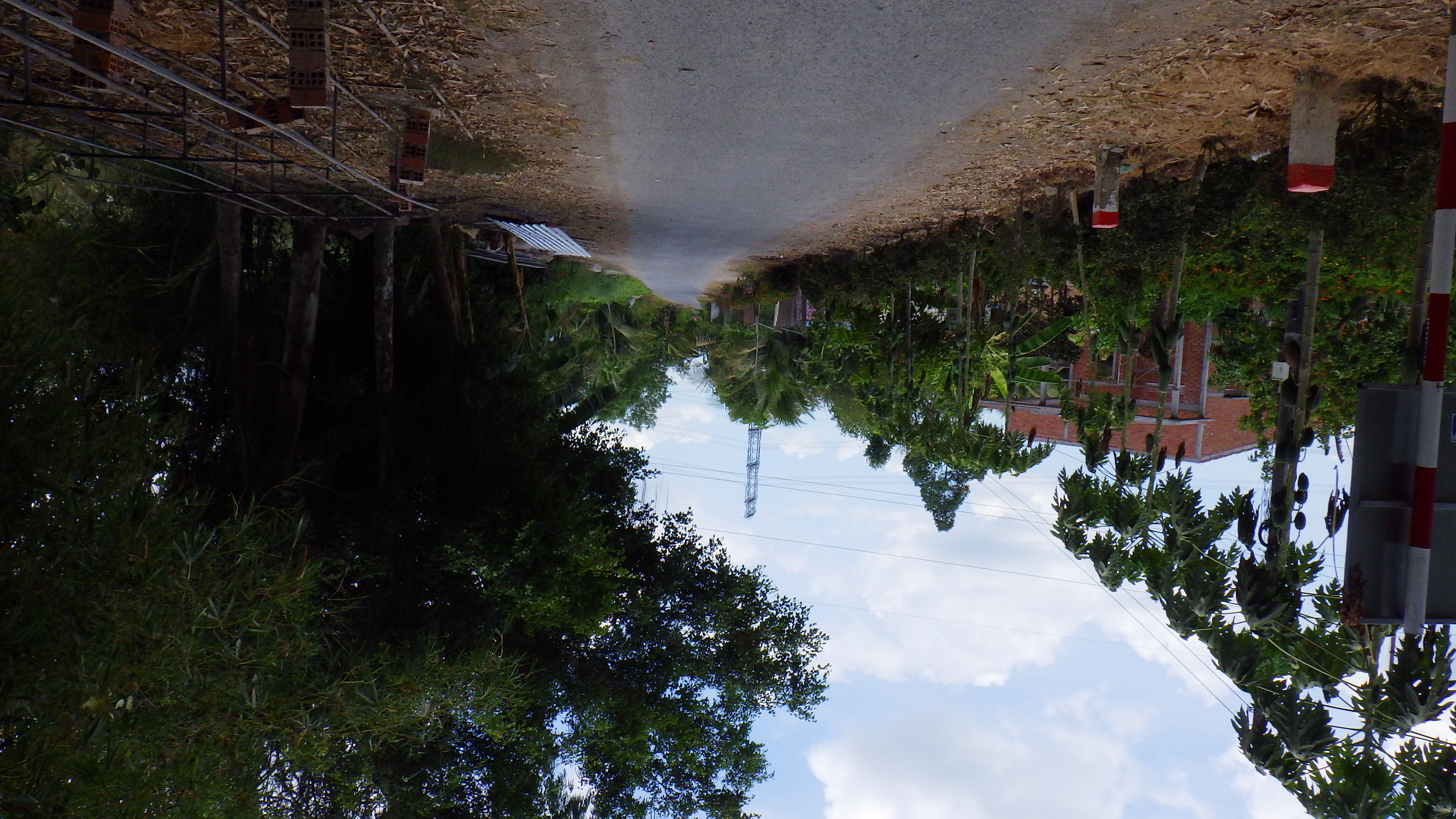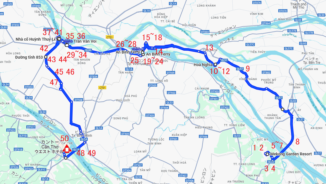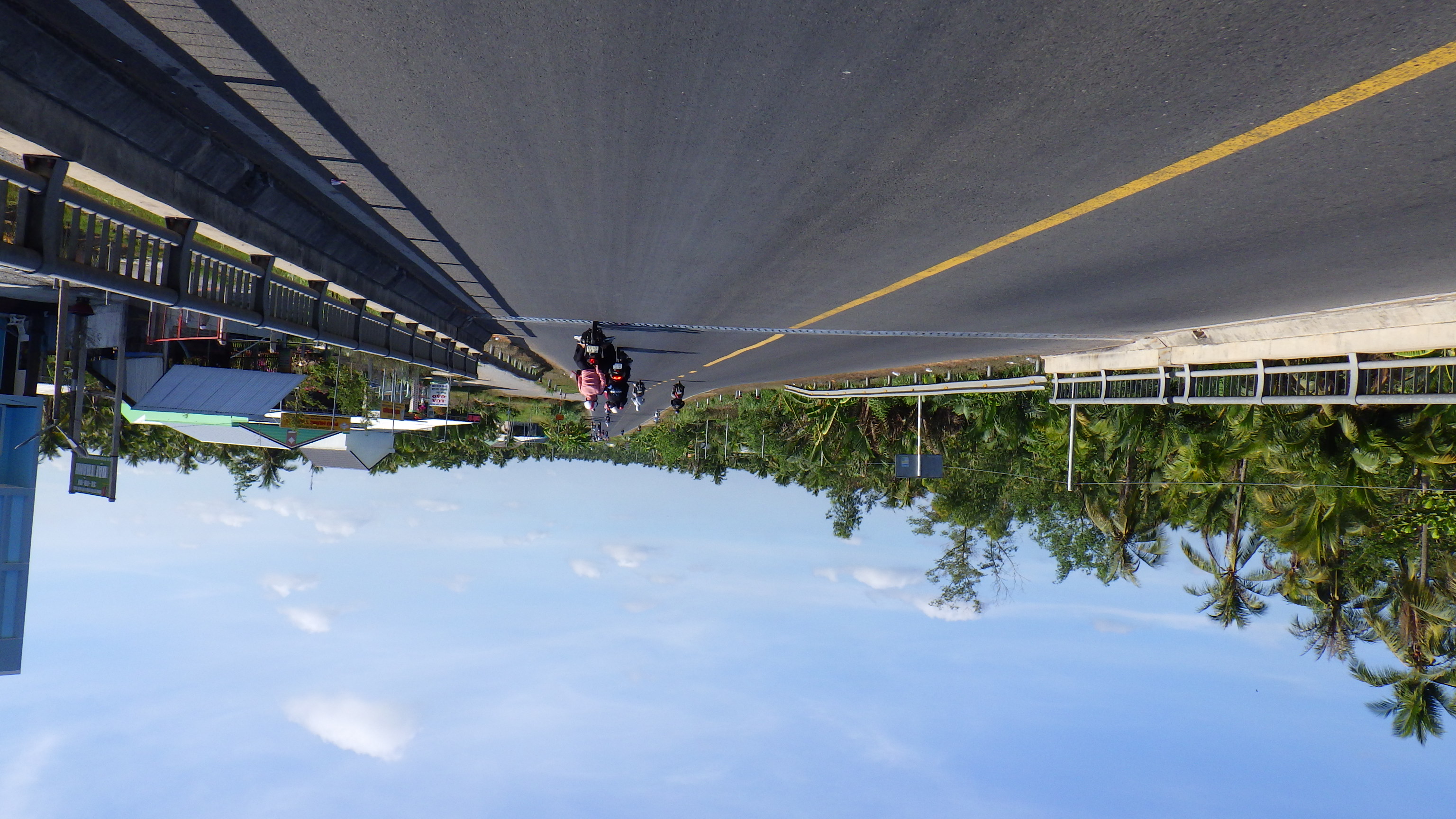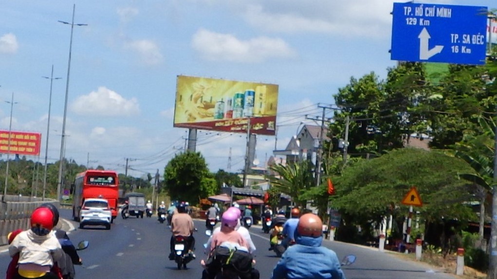 | Vinh Longの街中を通り抜けQL53からQL1Aに入る。行先看板がおかしいぞ、まっすぐ行くと道はSa Decに向かう高架をくぐり右の橋を越えてTien Giangに行ってしまう。Ho Chi Minhに行くならSa Dec同様右に行き高架を越えて左折だ。何度地図を確認してもそうだ。Sa Decに向かうので右に行く。その先国道はつまらないので渡船のある小道へ |
