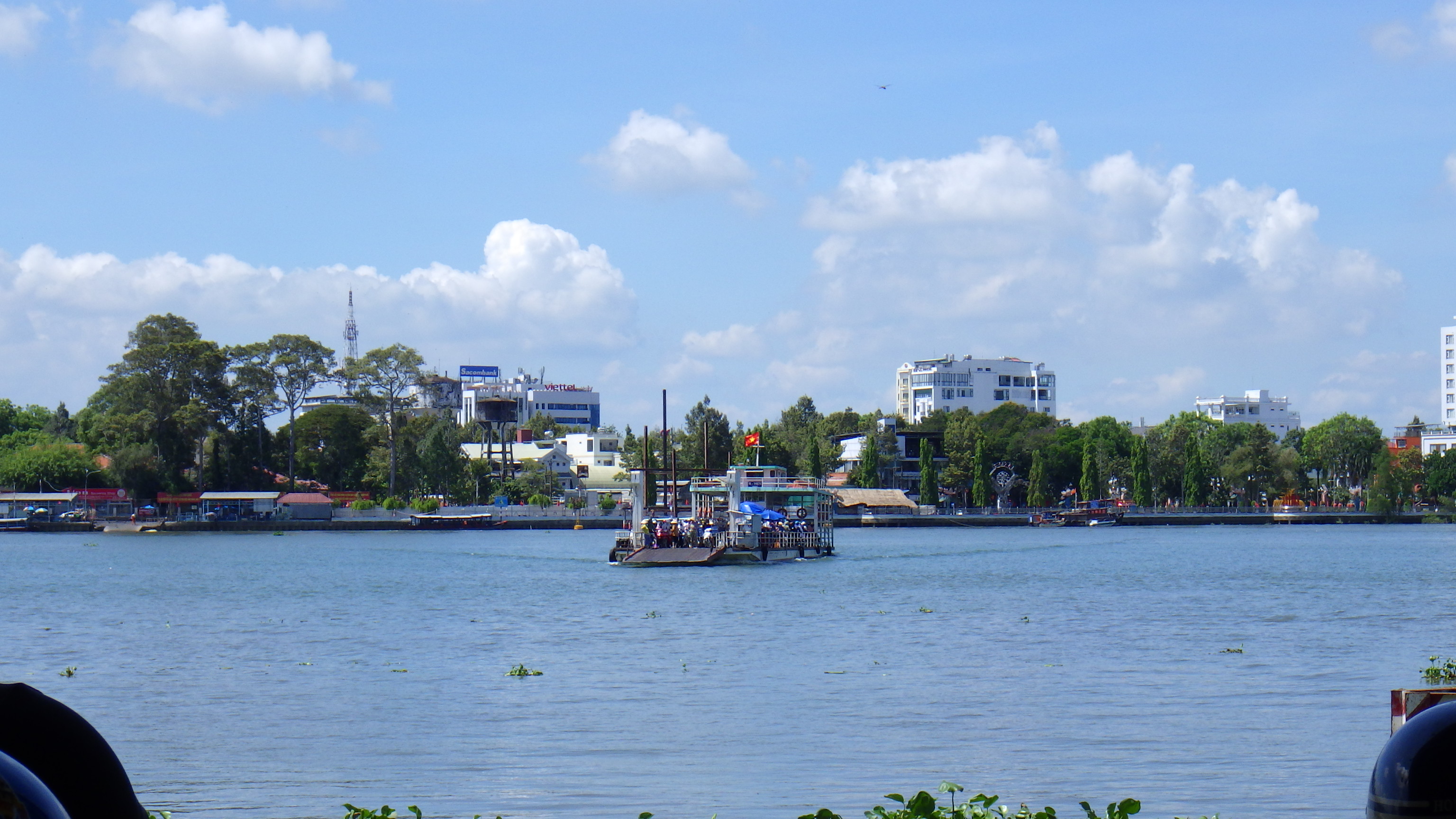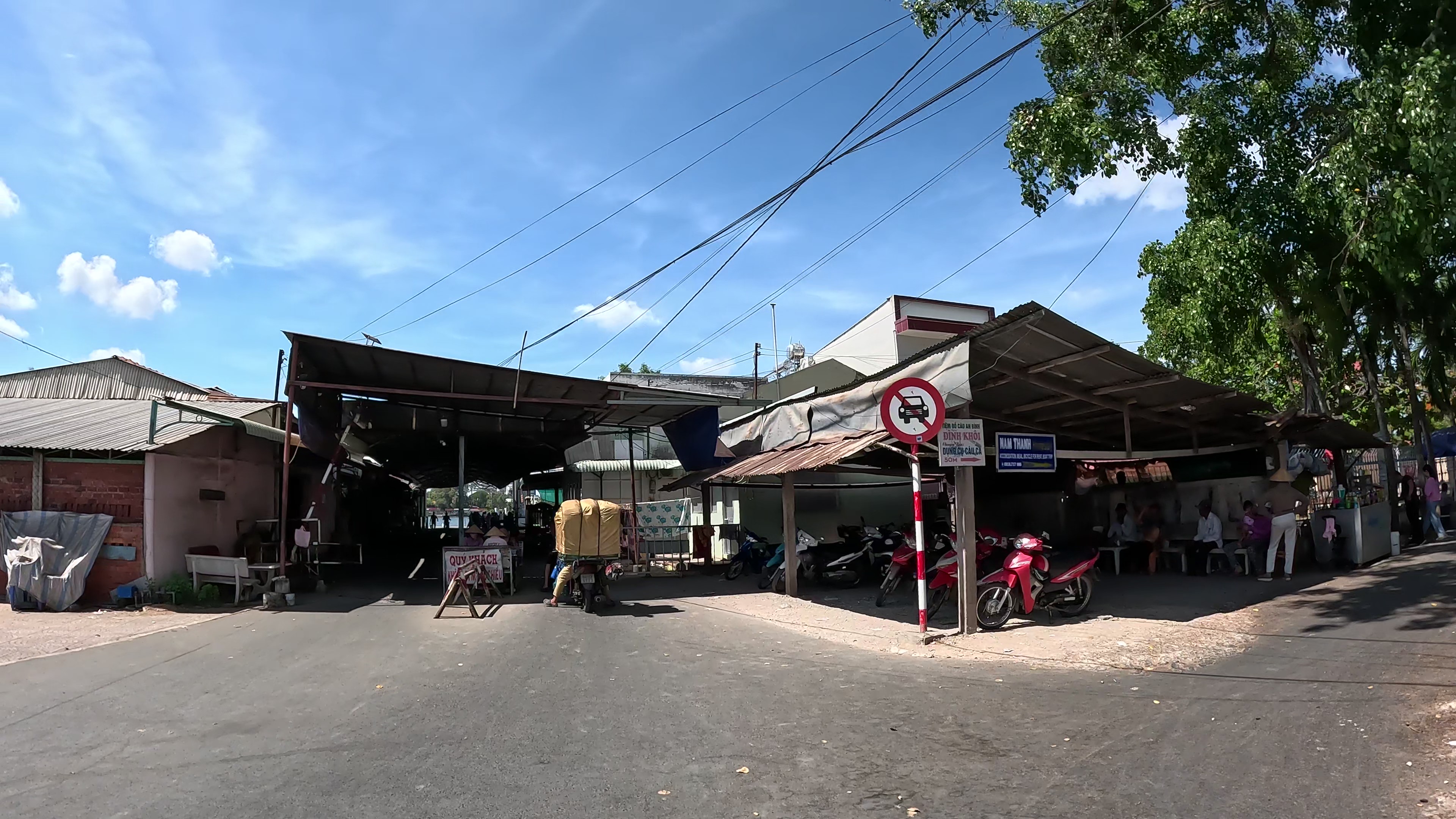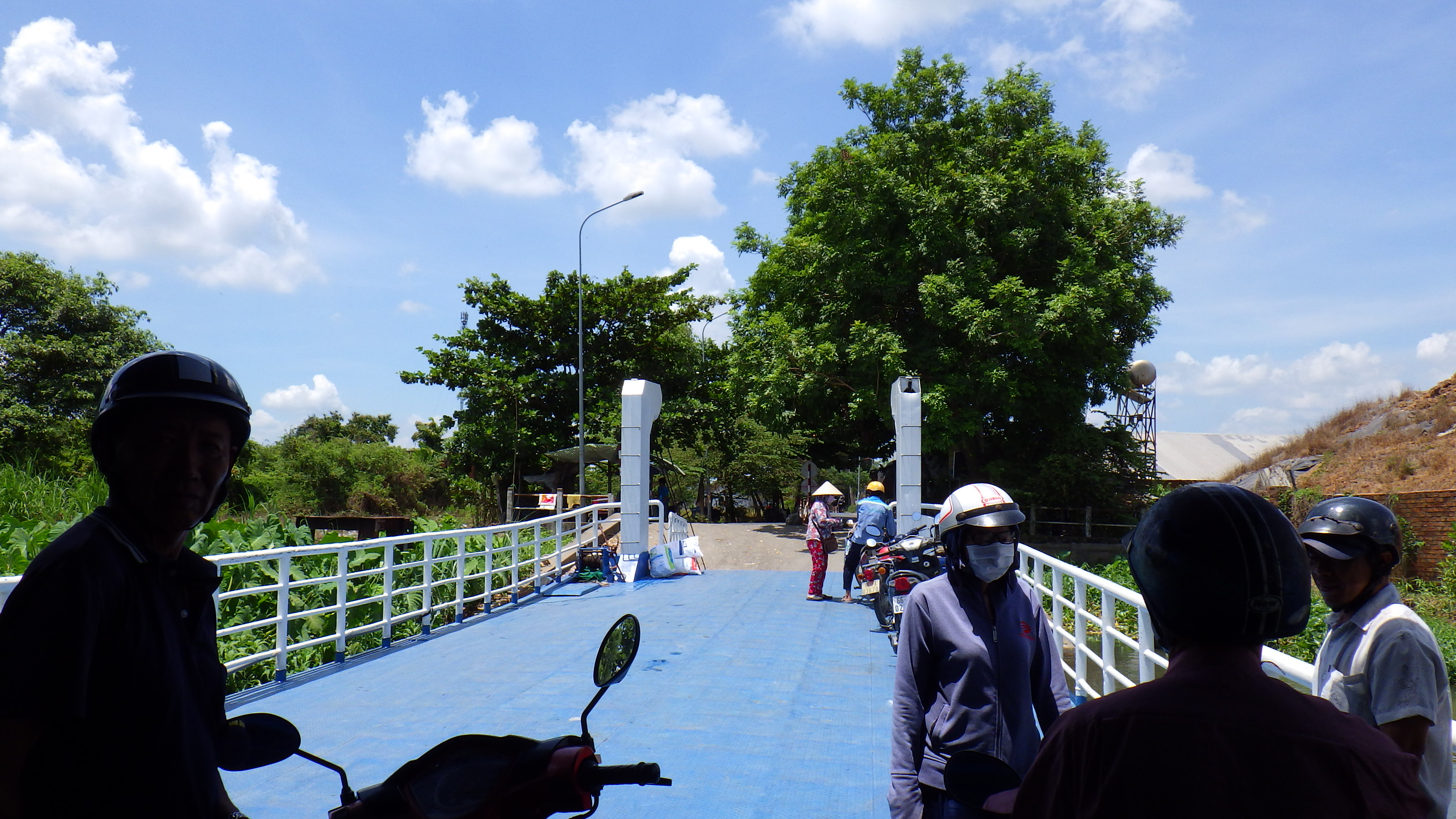 | 国道はつまらないので川沿いへ出ると涼しかった。Cho Lach街中の2輪専用の旧道の橋を渡り再び国道へ合流し進むと国道はそのままフェリー乗り場になり対岸の国道へとつながっている。国道フェリーということなのだろうが、その手前でローカル道に入りより上流のフェリー乗り場に向かう。 |