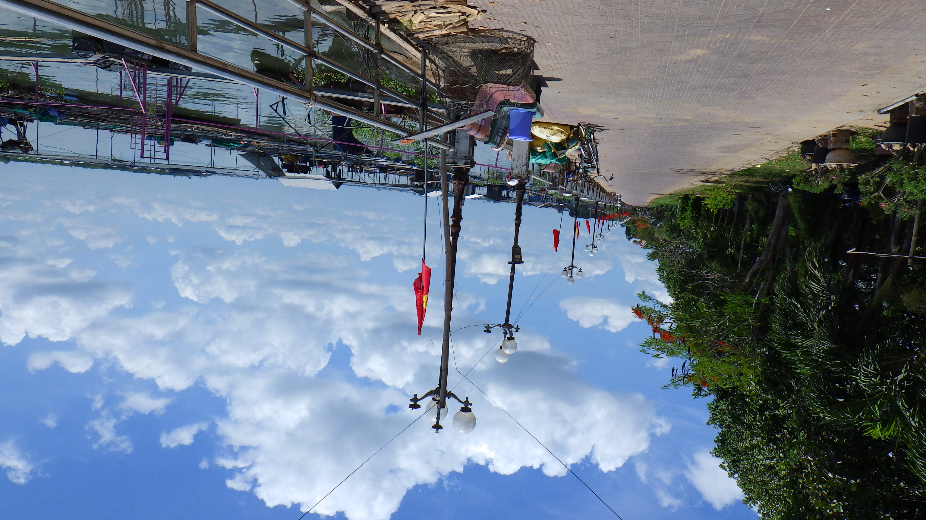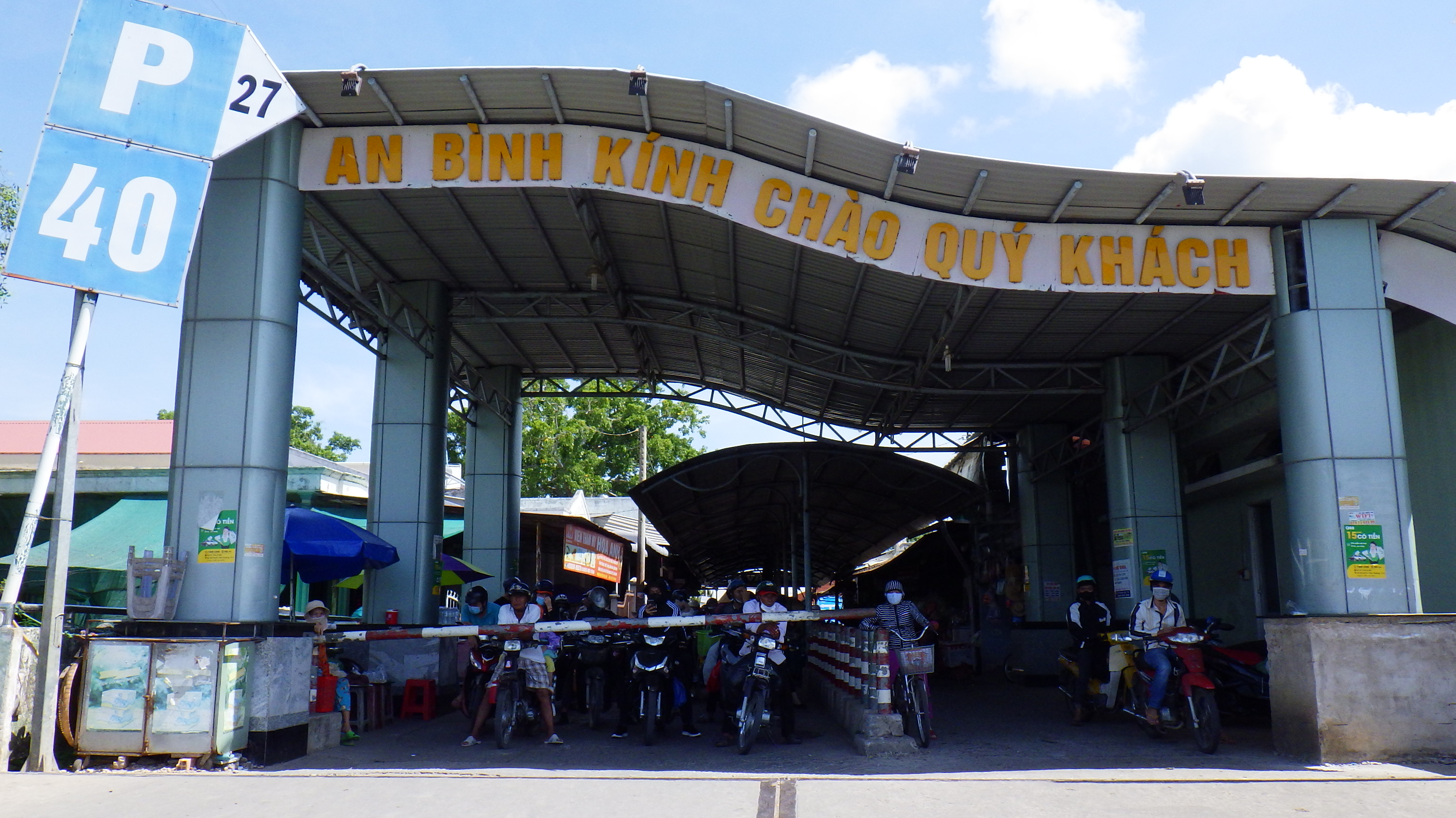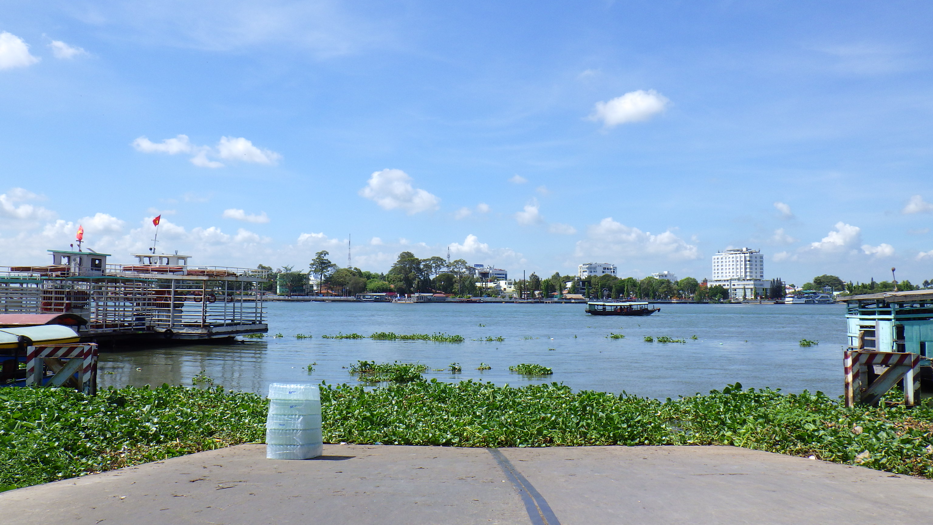 | 国道はつまらないので川沿いへ出ると涼しかった。Cho Lach街中の2輪専用の旧道の橋を渡り再び国道へ合流し進むと国道はそのままフェリー乗り場になり対岸の国道へとつながっている。国道フェリーということなのだろうが、その手前でローカル道に入りより上流のフェリー乗り場に向かう。 |