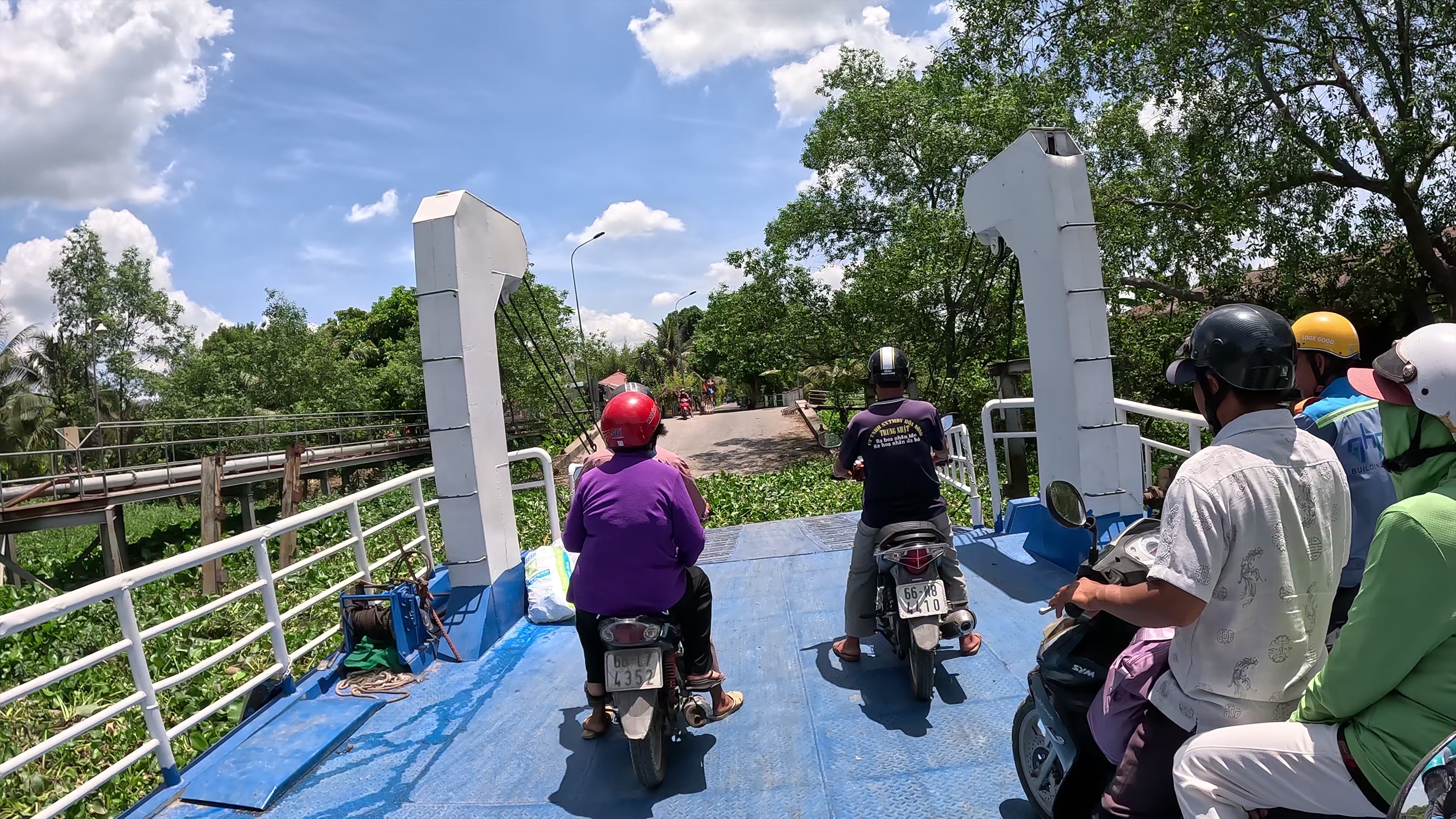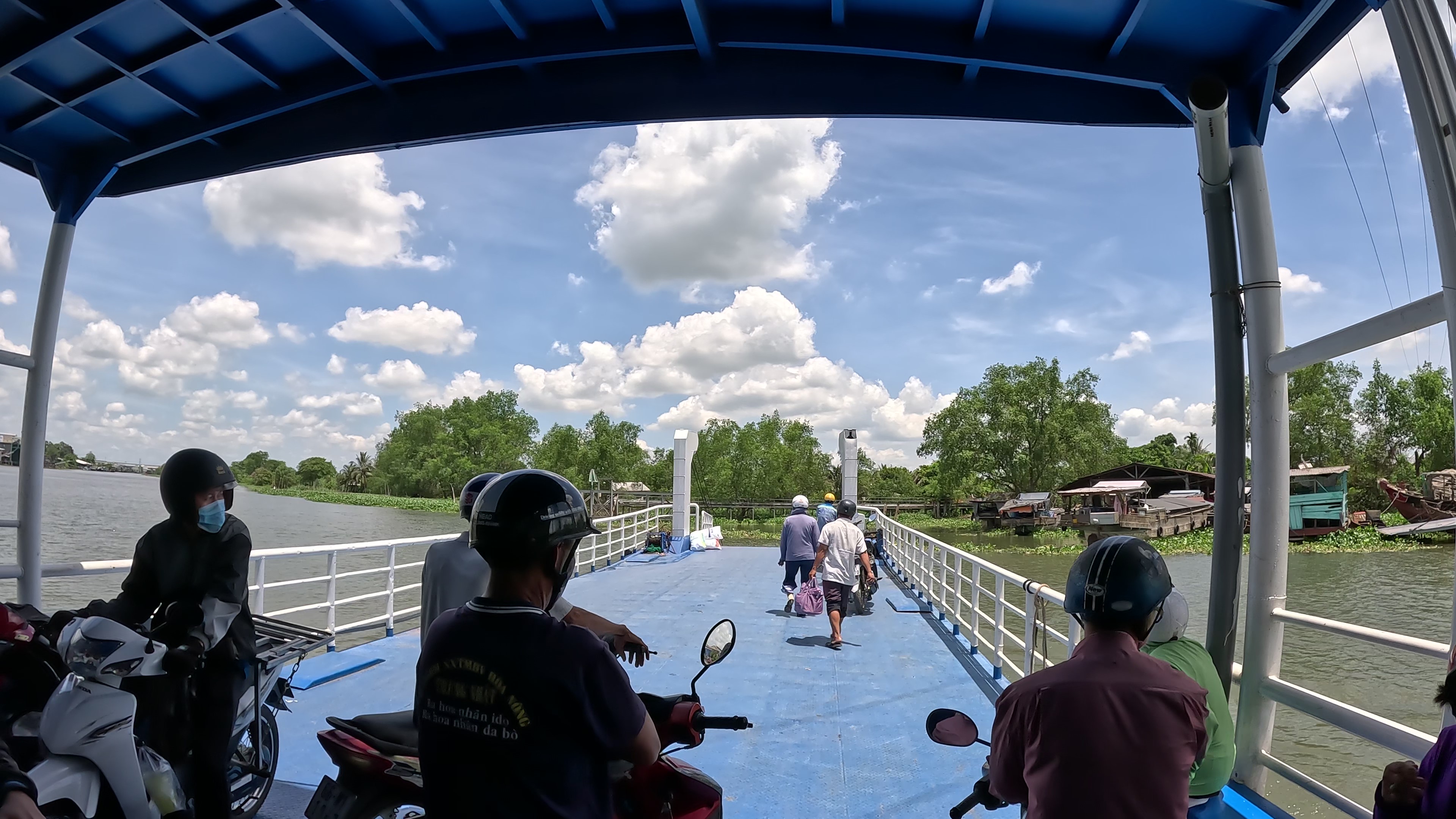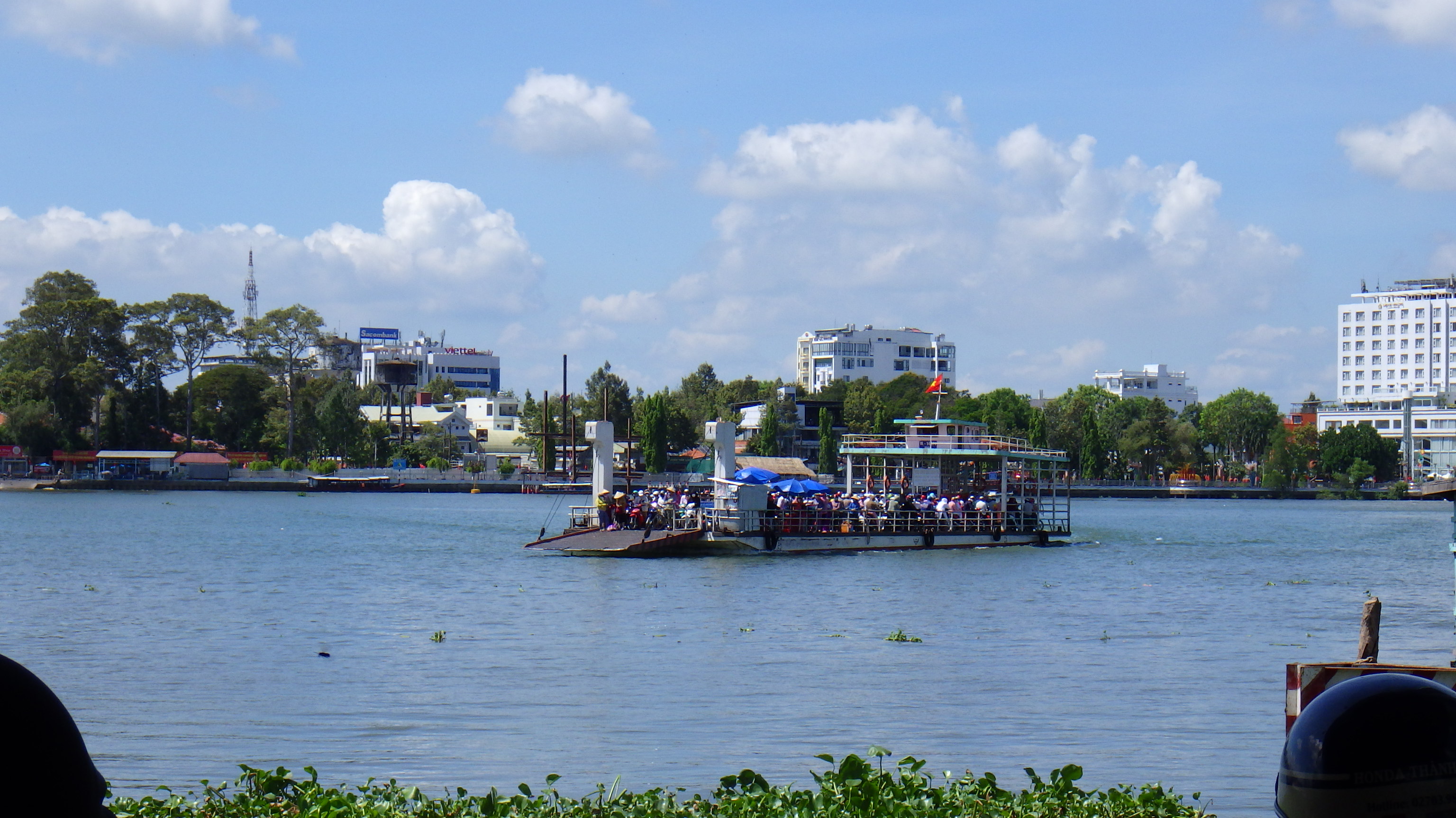 | フェリー4,000VND(24円)から降りてくるバイクを待つことなく乗ろうとするので大混乱(笑)。フェリーは川の流れを考えてなのか不思議な角度で対岸のVinh Longへ。 |