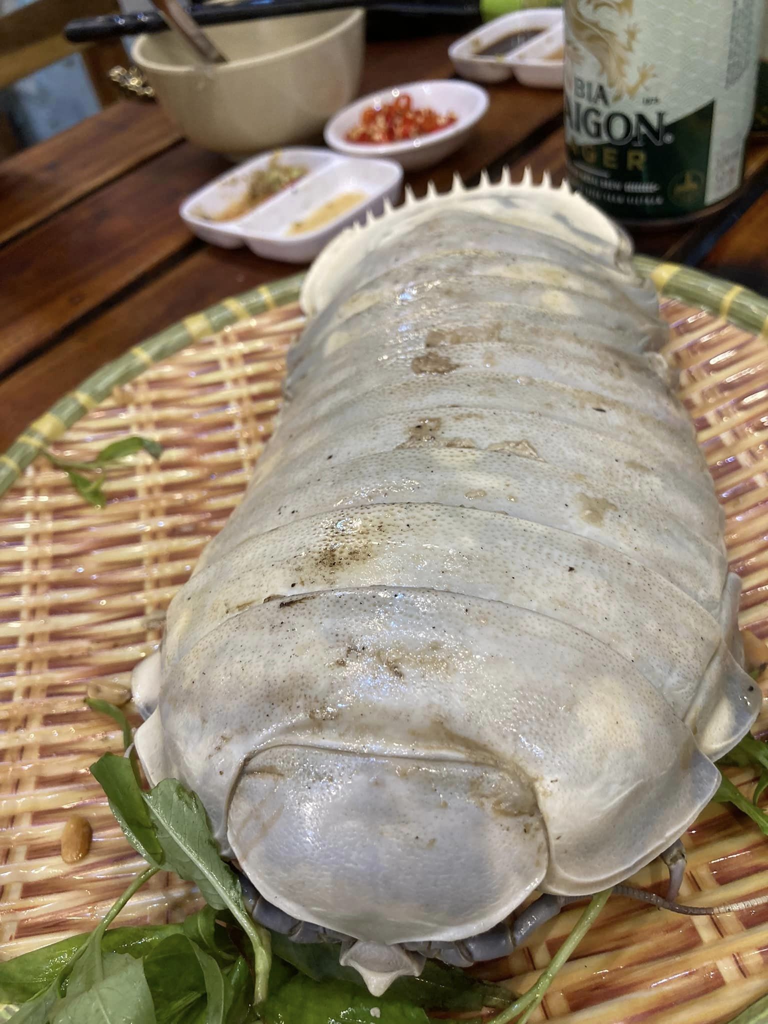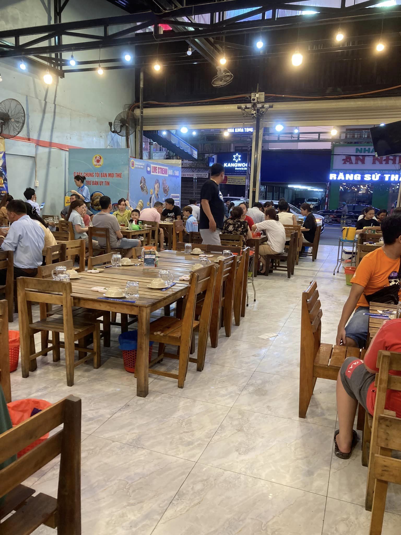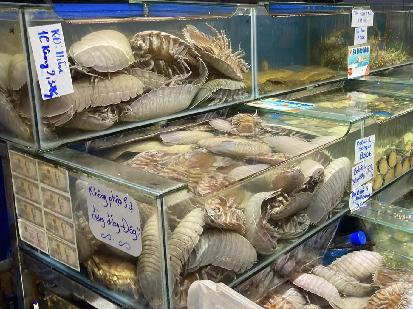 | 夕食はVua cuaCa Mau- Dang Quan 6時15分には空きテーブル1という人気 海産物を買いに来てる人も多数。でっかいイセエビが9700円/kg、普通サイズが8480円/kg、 グソクムシ900g=5190円/匹、500g=3360円/匹 ひらめ 4430円/kg |