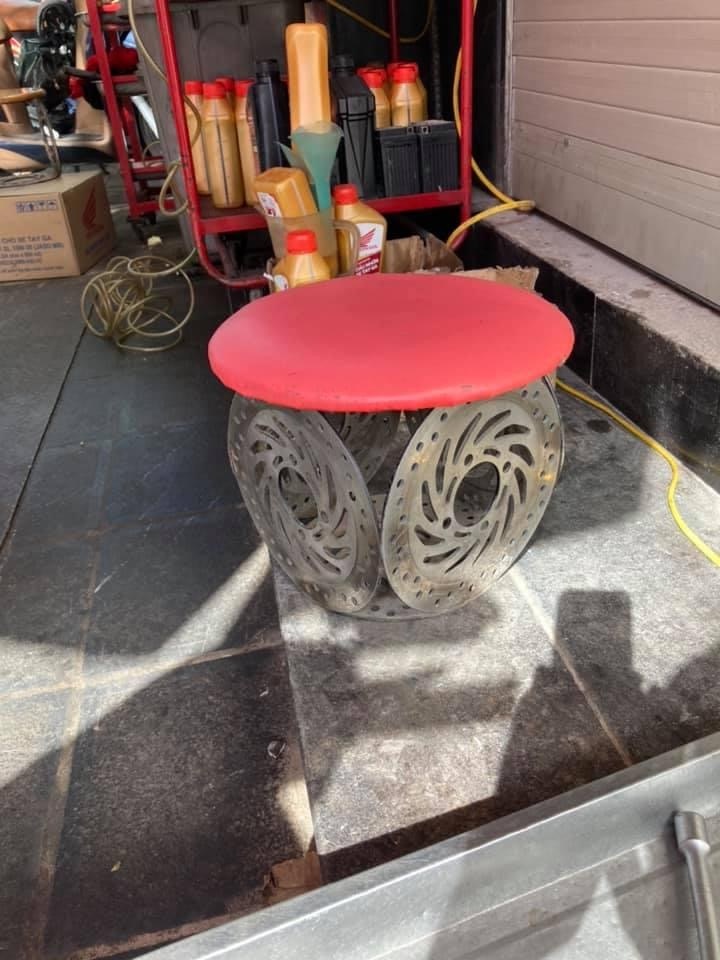 購入して5か月経つが走行距離140q。もう少し走行した後でもよいのだろうが、いったんここでオイル交換することにした。ホンダにオイル交換してくれと言うと、500qで交換という事になっていると言われたが、もう買って半年になるので交換しておきますと言って交換してもらった。料金85,000VND=400円程度でした。 交換時にすごく気になったのがこの椅子。ブレーキローター5枚を組み合わせて椅子にしている。ほしいなという気持ちに少しなりました。 |