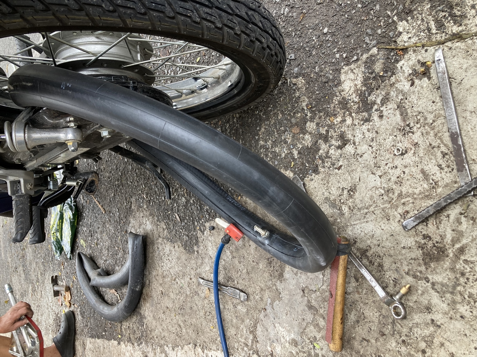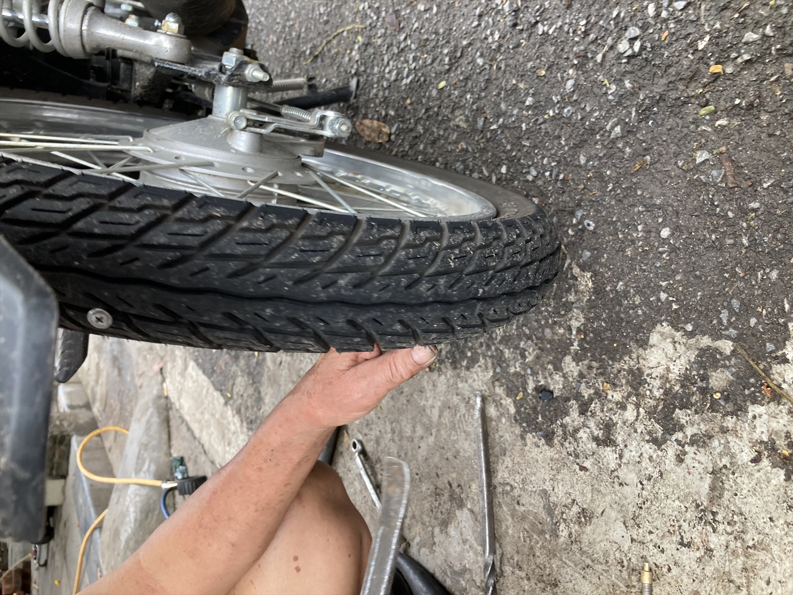 | 22.07.24 Soc Sonのオフロードを走りに行ったとき、CB500Xでは重すぎるのでWaveで行った。その時にWaveのタイヤをオフタイヤに履き替えておけばより楽しいと思っていたのだが、来週の土曜日に以前CB500Xで敗退したQuang Ninhのオフロードに再度行くこととなったので急遽オフタイヤに履き替えることにした。まずはタイヤを探しにいった。何を言っているのかほぼ聞き取れなかったが在庫がないので取り寄せる、あとで来てくれということらしい。指定の時間に行くと、親切にもタイヤを履き替える店まで案内してくれてなんだかうれしくなった。タイヤ前後で650,000Vnd (約4000円)履き替え工賃100,000Vnd(600円) |