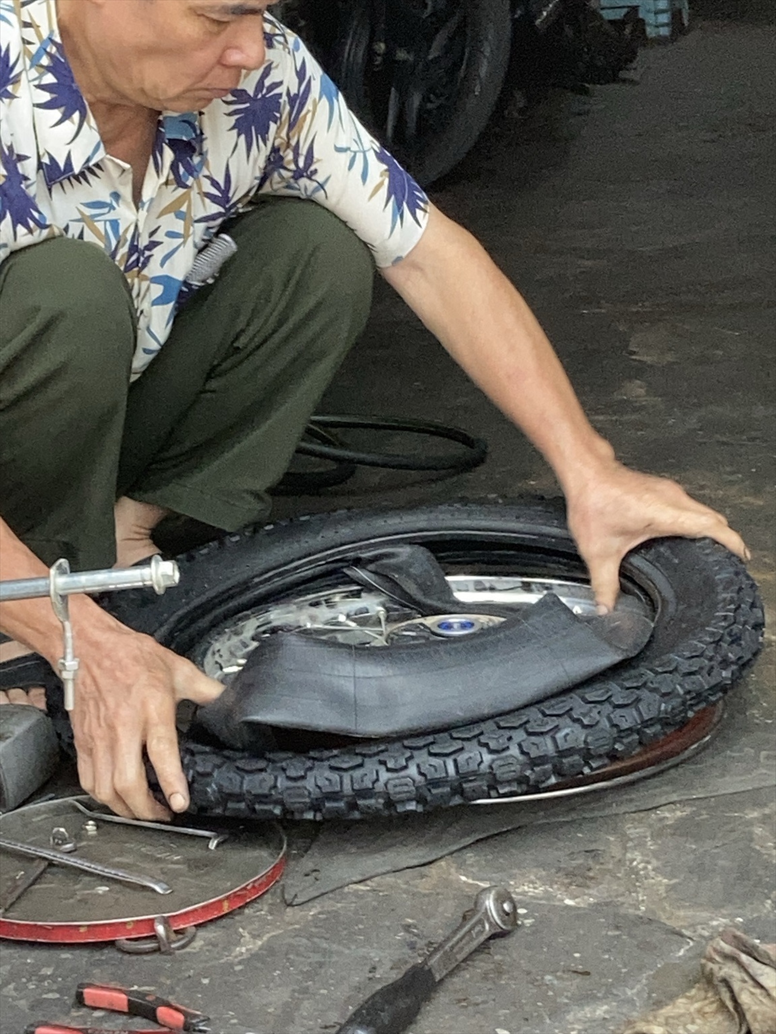 | 22.07.06 今度はパンクだ。夜中にパンクしたためそのまま走り続けかえってきた。翌朝修理に持ってゆくと案の定チューブの交換となった。露店の修理屋だが修理費用120,000Vndということは660円ぐらい。 安すぎるぞ |